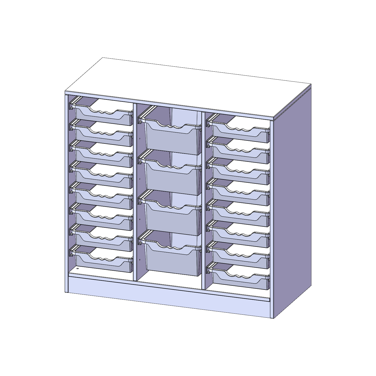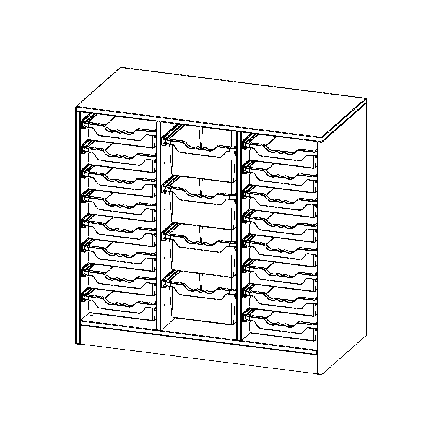B/H/T: 104,5x100x50 cm, mit Sockel (81 mm), rechts und links je 8 flache, in der Mitte 4 hohe ErgoTray Boxen