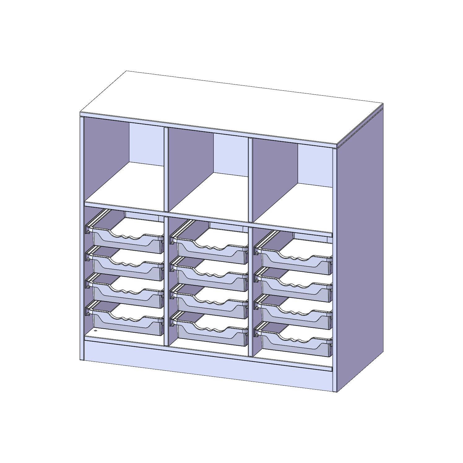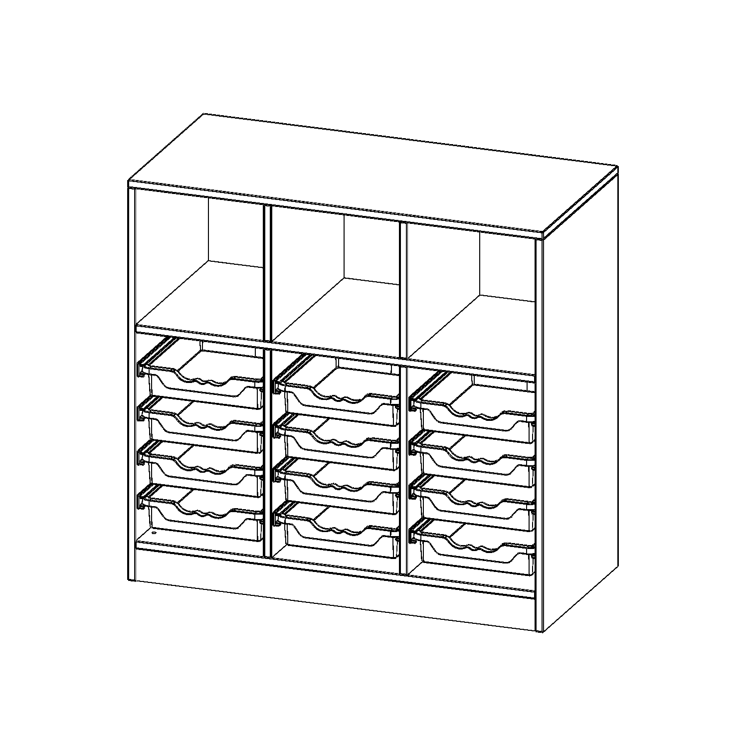 B/H/T: 104,5x100x50 cm, mit Sockel (81 mm), oben 3 Fächer, unten 12 flache ErgoTray Boxen