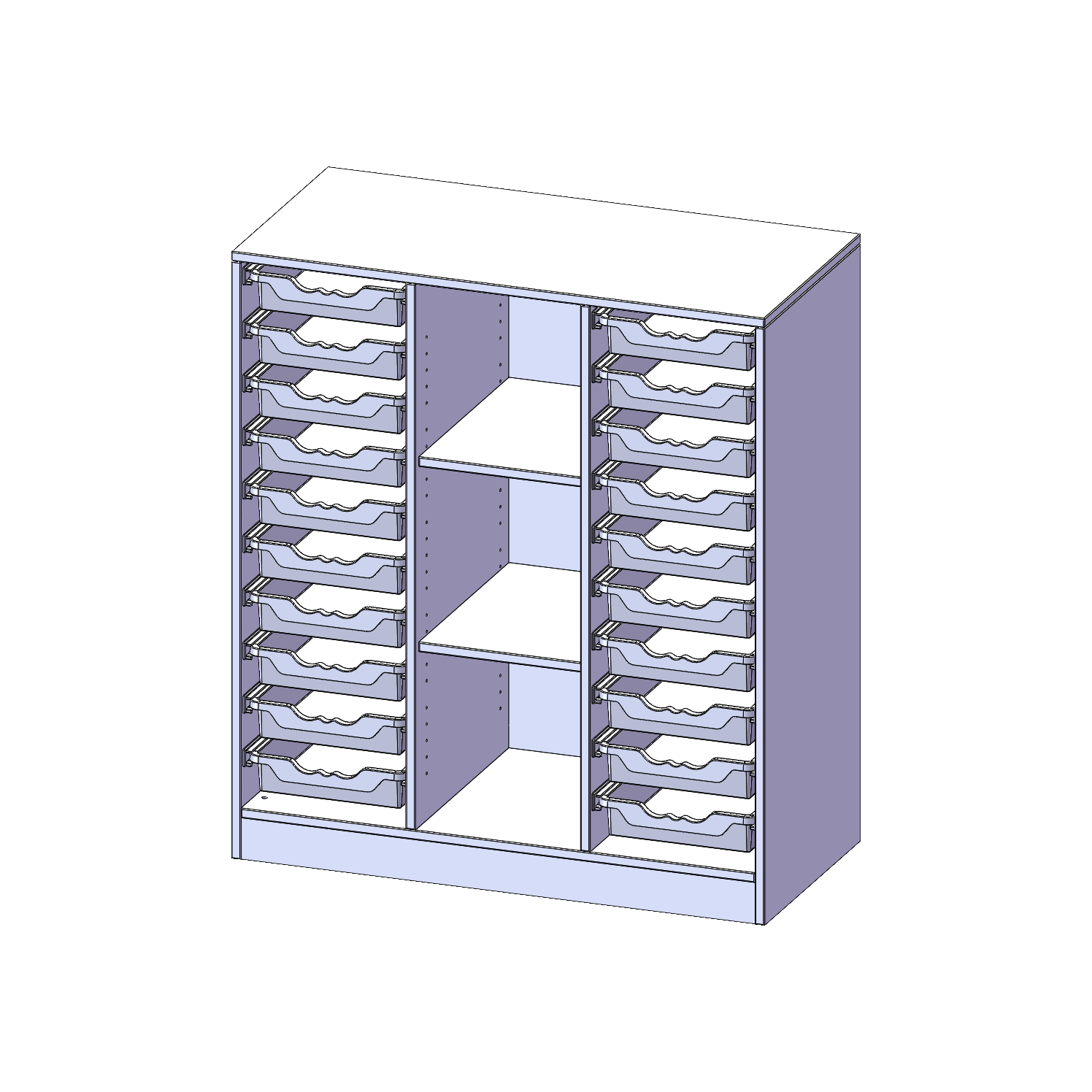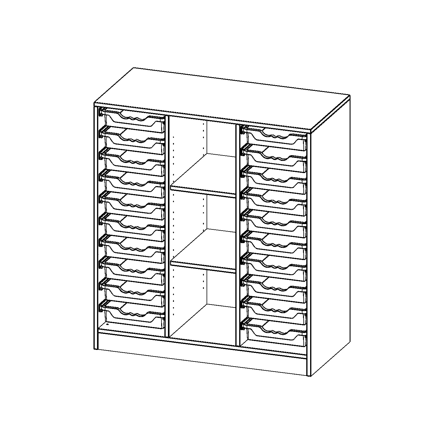 B/H/T: 104,5x118x50 cm, mit Sockel (81 mm), rechts und links je 10 flache ErgoTray Boxen, 3 Fächer in der Mitte
