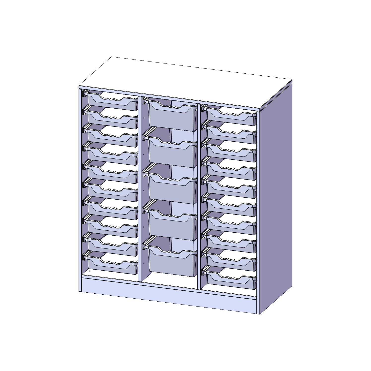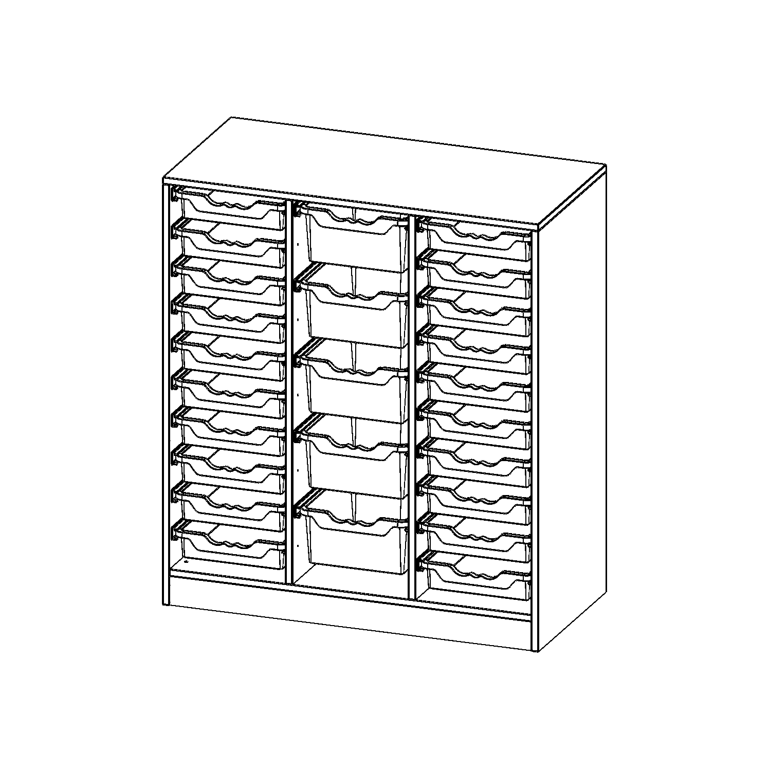 B/H/T: 104,5x118x50 cm, mit Sockel (81 mm), rechts und links je 10 flache, in der Mitte 5 hohe ErgoTray Boxen