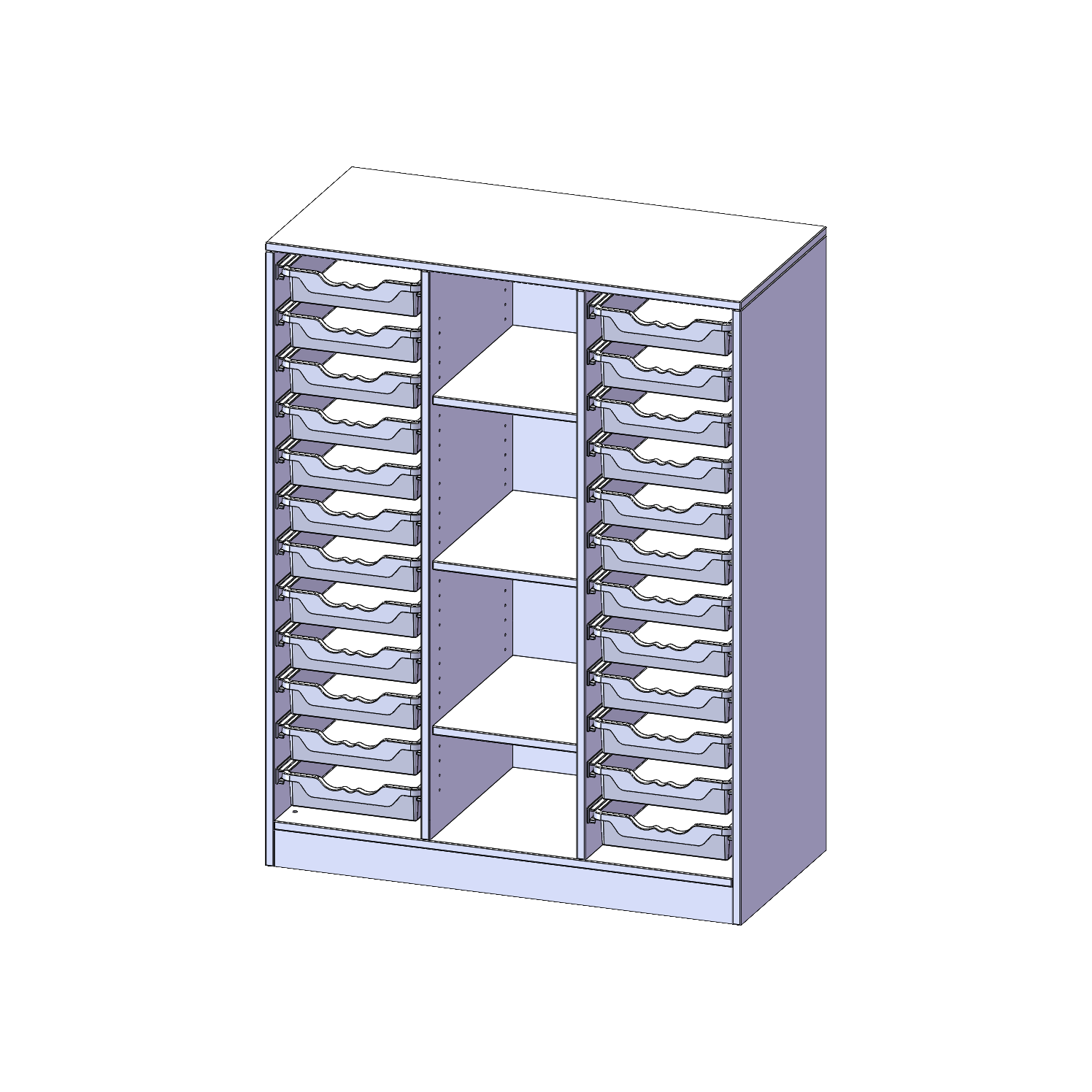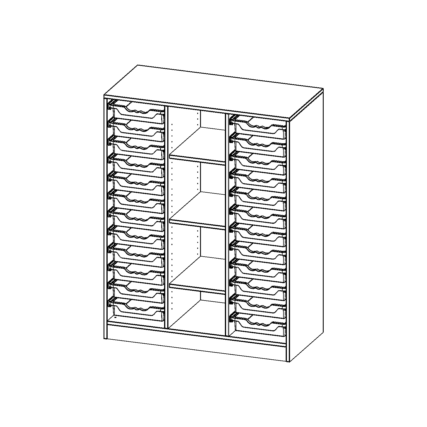 B/H/T: 104,5x136x50 cm, mit Sockel (81 mm), rechts und links je 12 flache ErgoTray Boxen, 4 Fächer in der Mitte