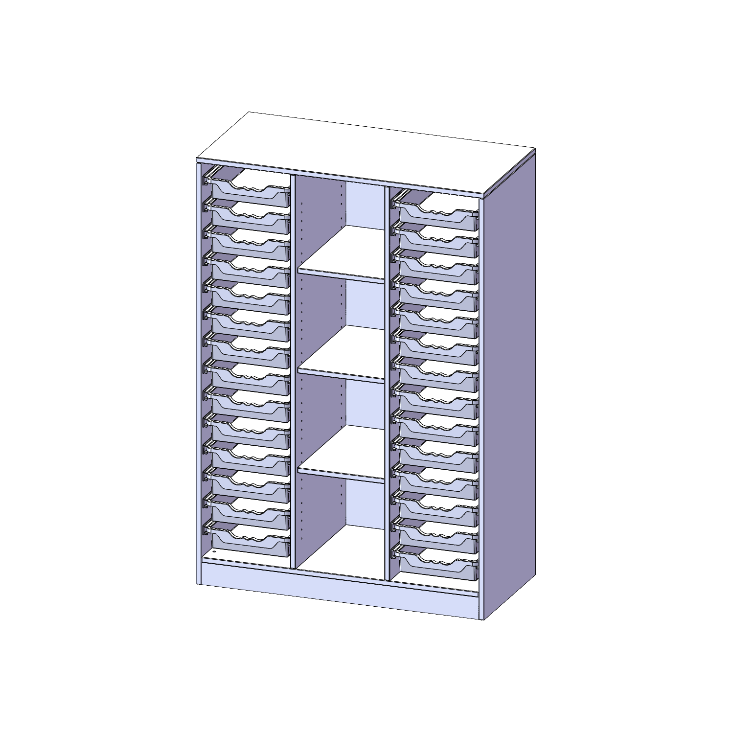 B/H/T: 104,5x154x50 cm, mit Sockel (81 mm), rechts und links je 14 flache ErgoTray Boxen, 4 Fächer in der Mitte
