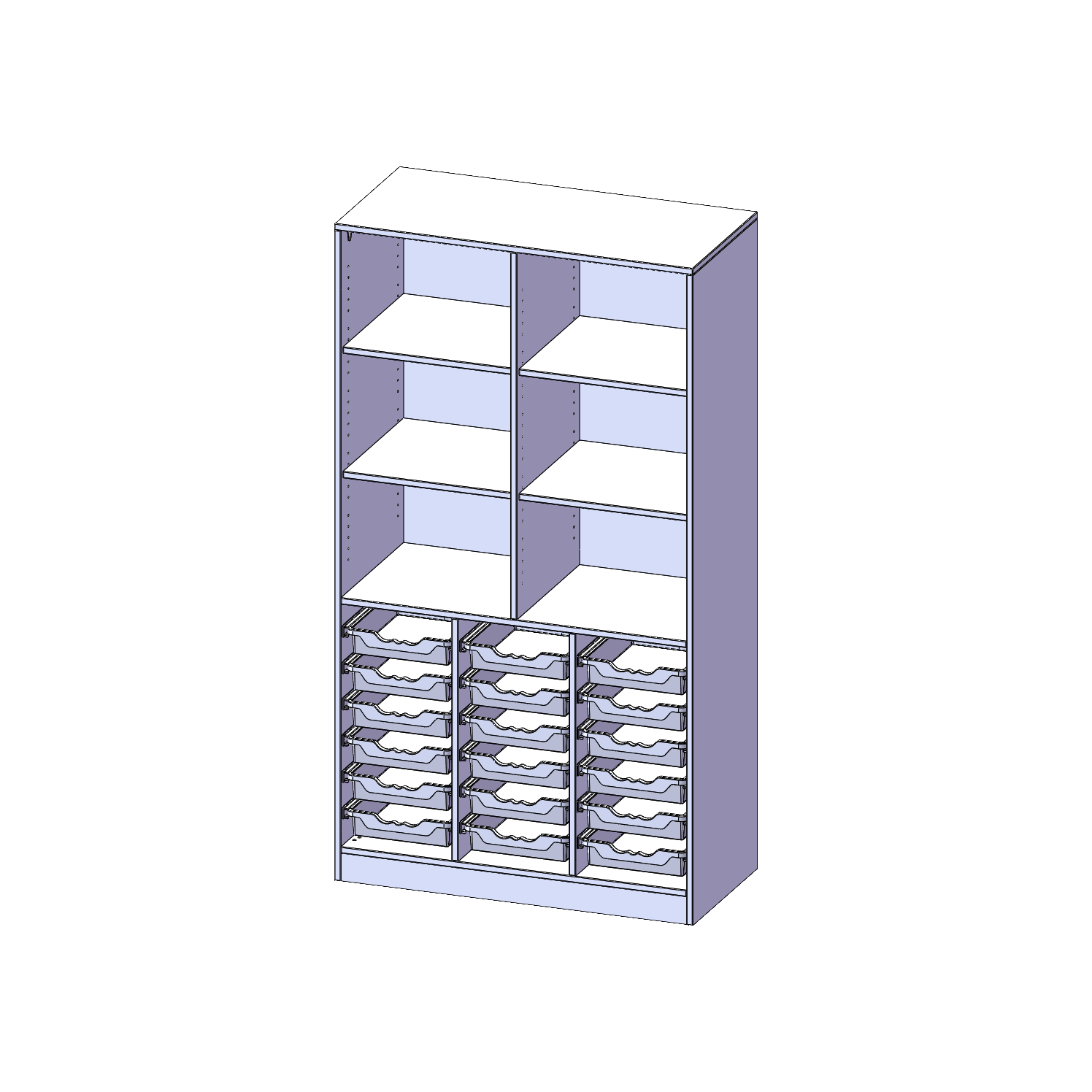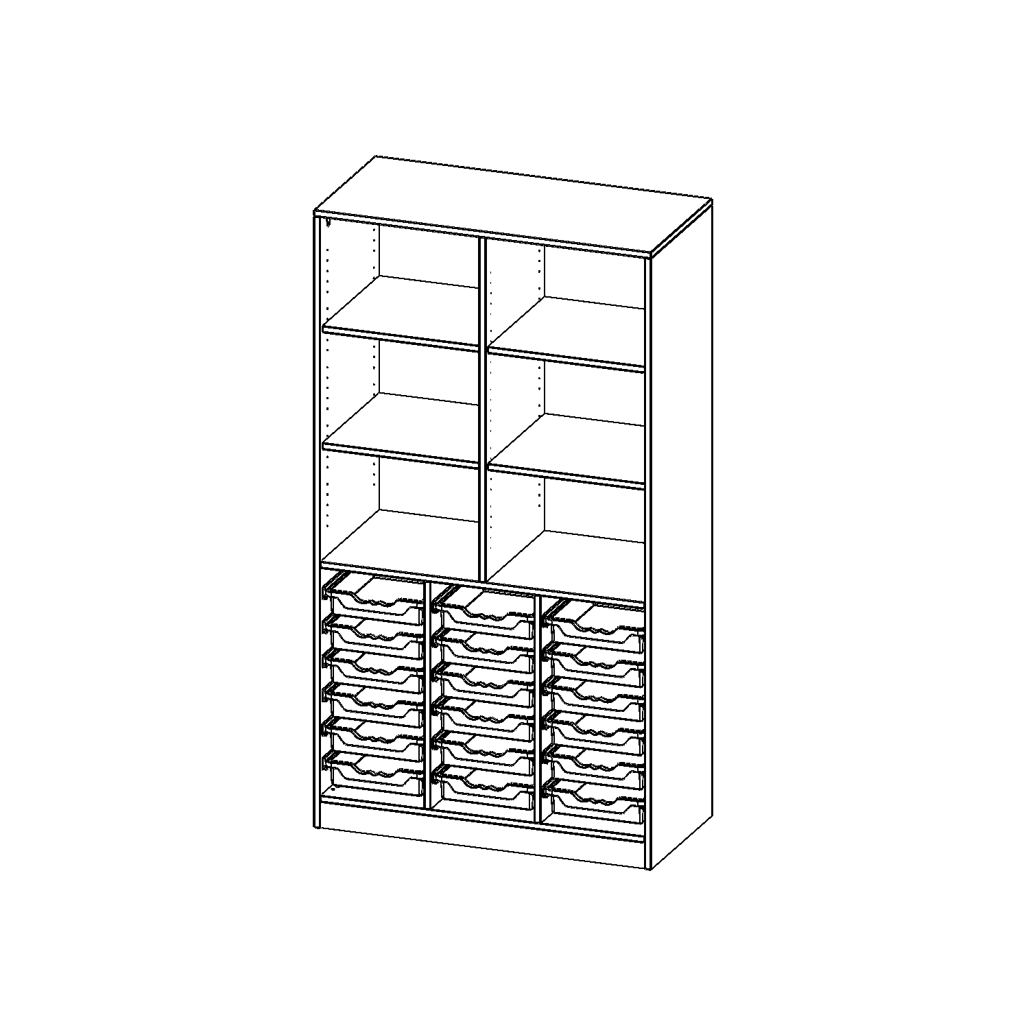 B/H/T: 104,5x190x50 cm, mit Sockel (81 mm), unten 18 flache ErgoTray Boxen, oben 4 Einlegeböden