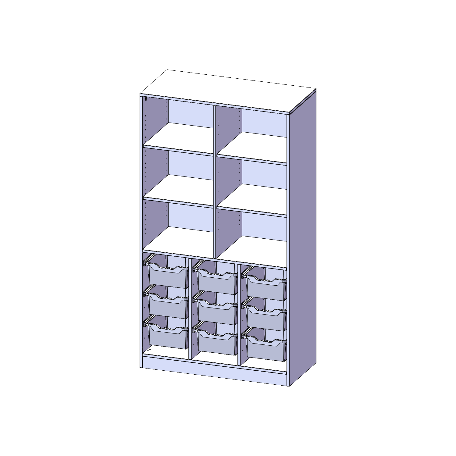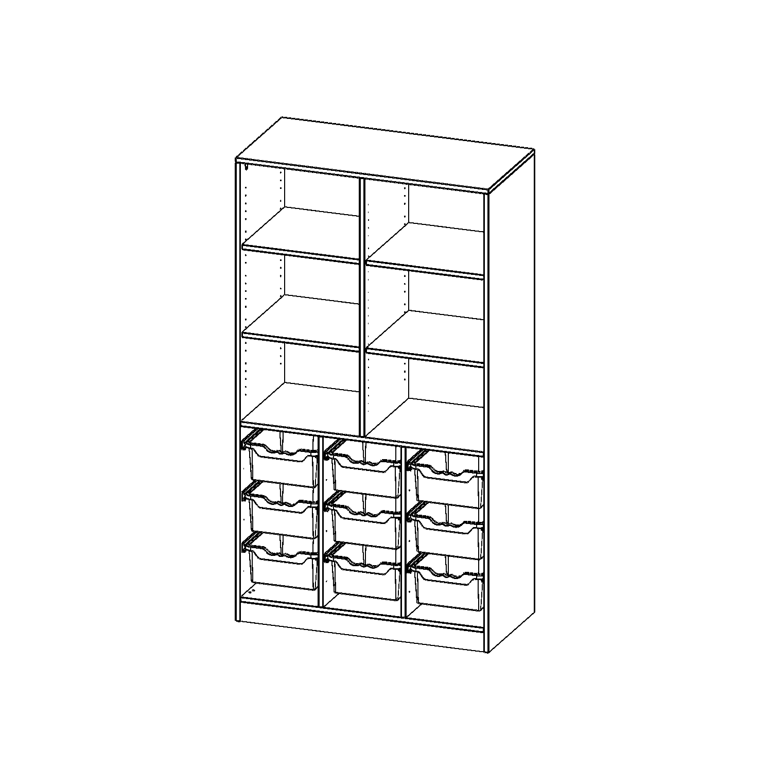 B/H/T: 104,5x190x50 cm, mit Sockel (81 mm), unten 9 hohe ErgoTray Boxen, oben 4 Einlegeböden