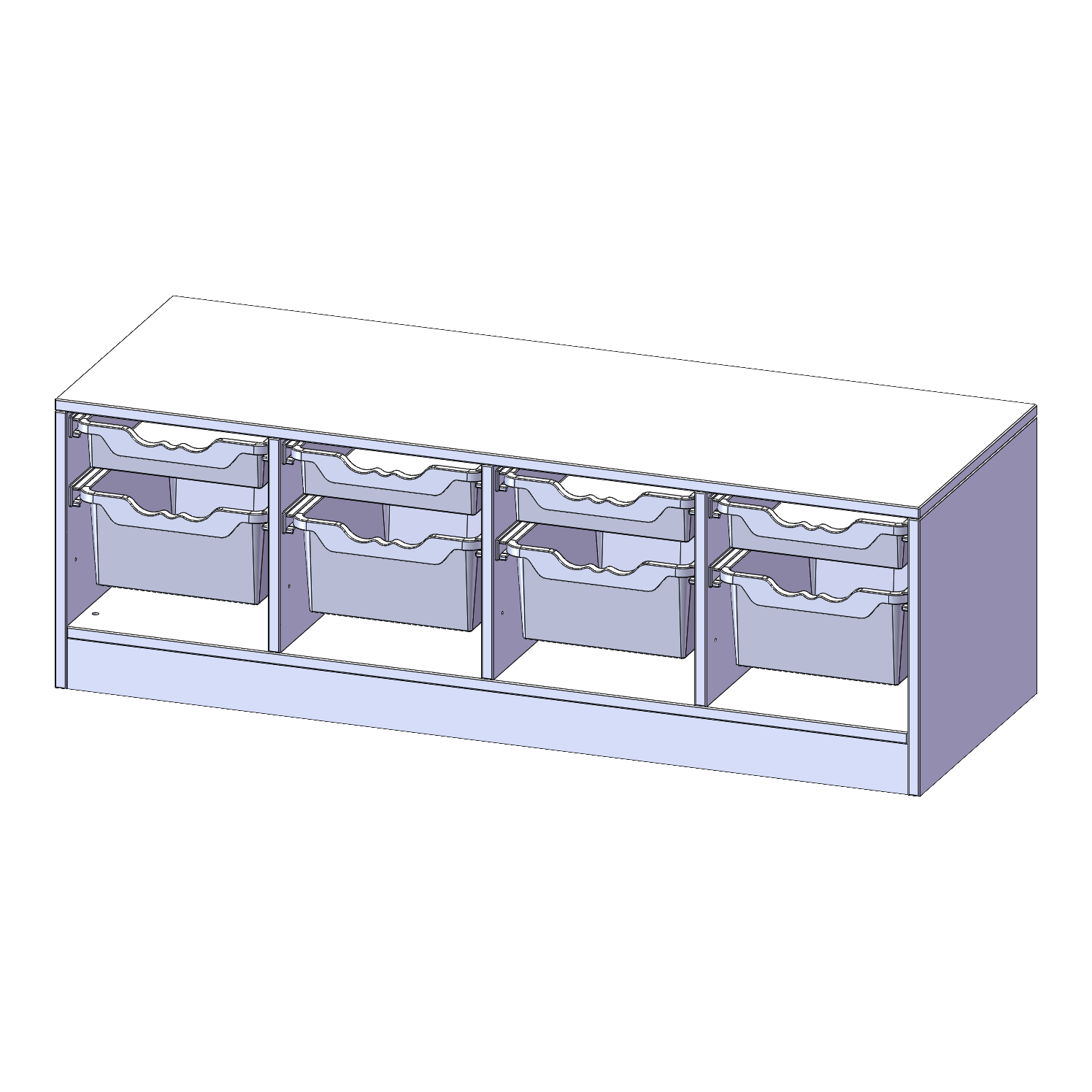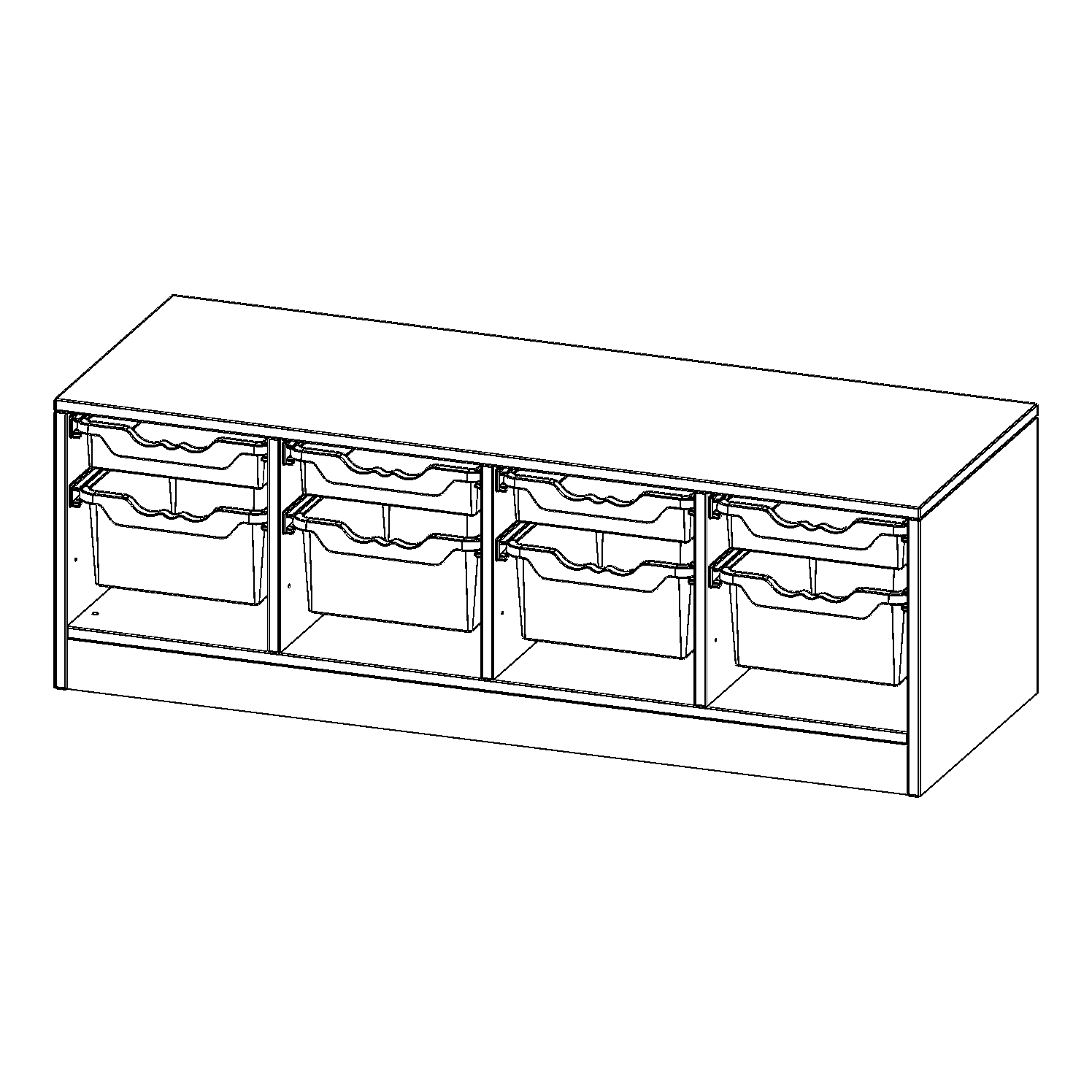 B/H/T: 138,7x46x50 cm, mit Sockel (81 mm), 4 flache und 4 hohe ErgoTray Boxen