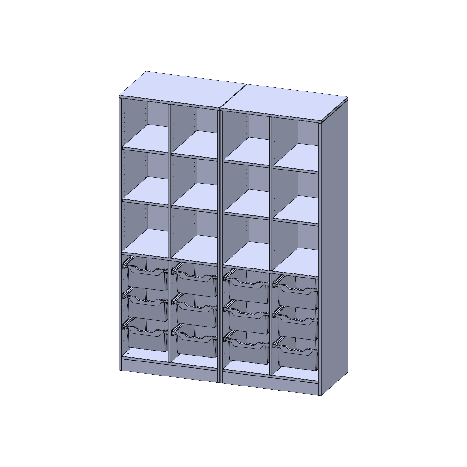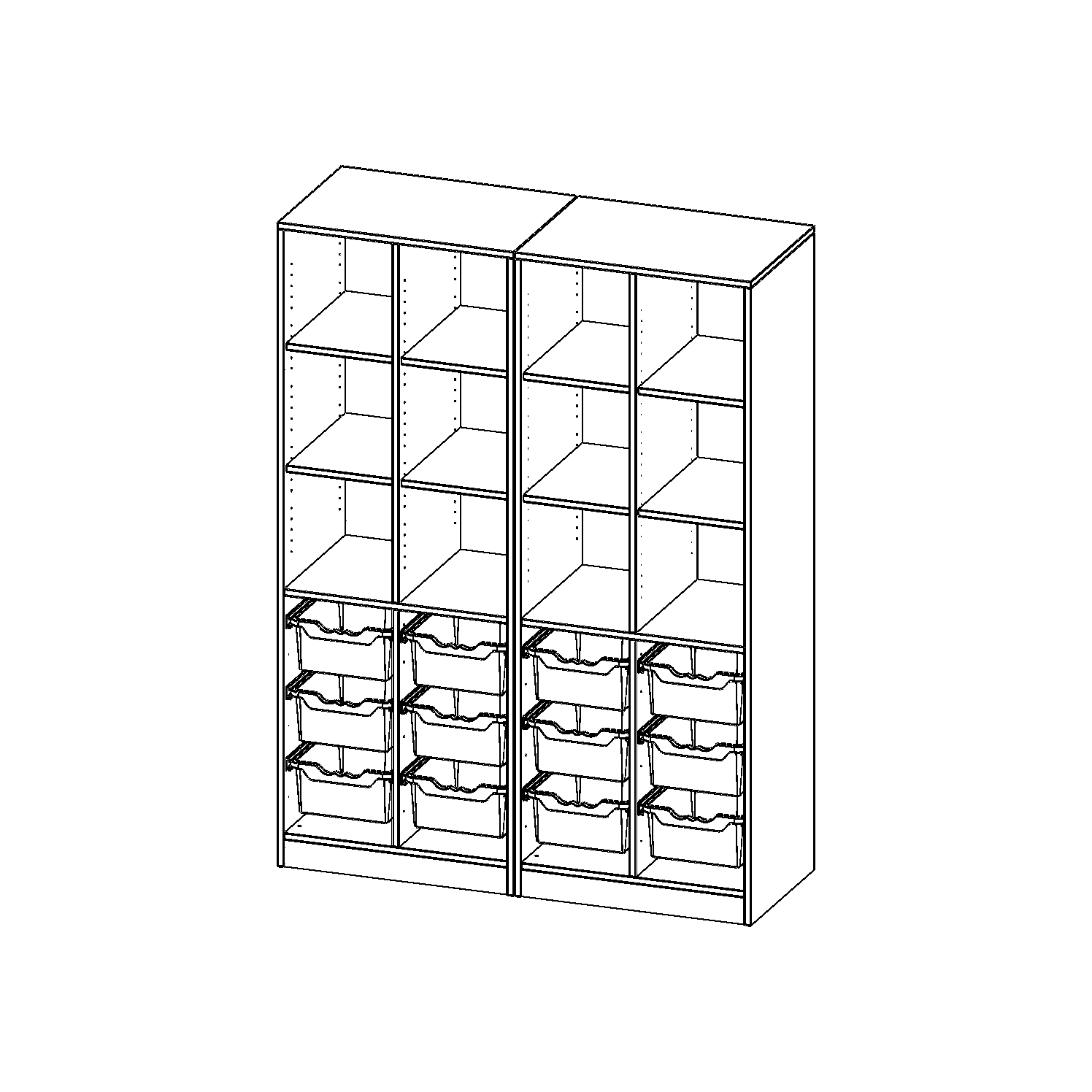 B/H/T: 140,6x190x50 cm, mit Sockel (81 mm), zweiteilig und Mittelwand, unten 12 hohe ErgoTray Boxen, oben 8 Einlegeböden
