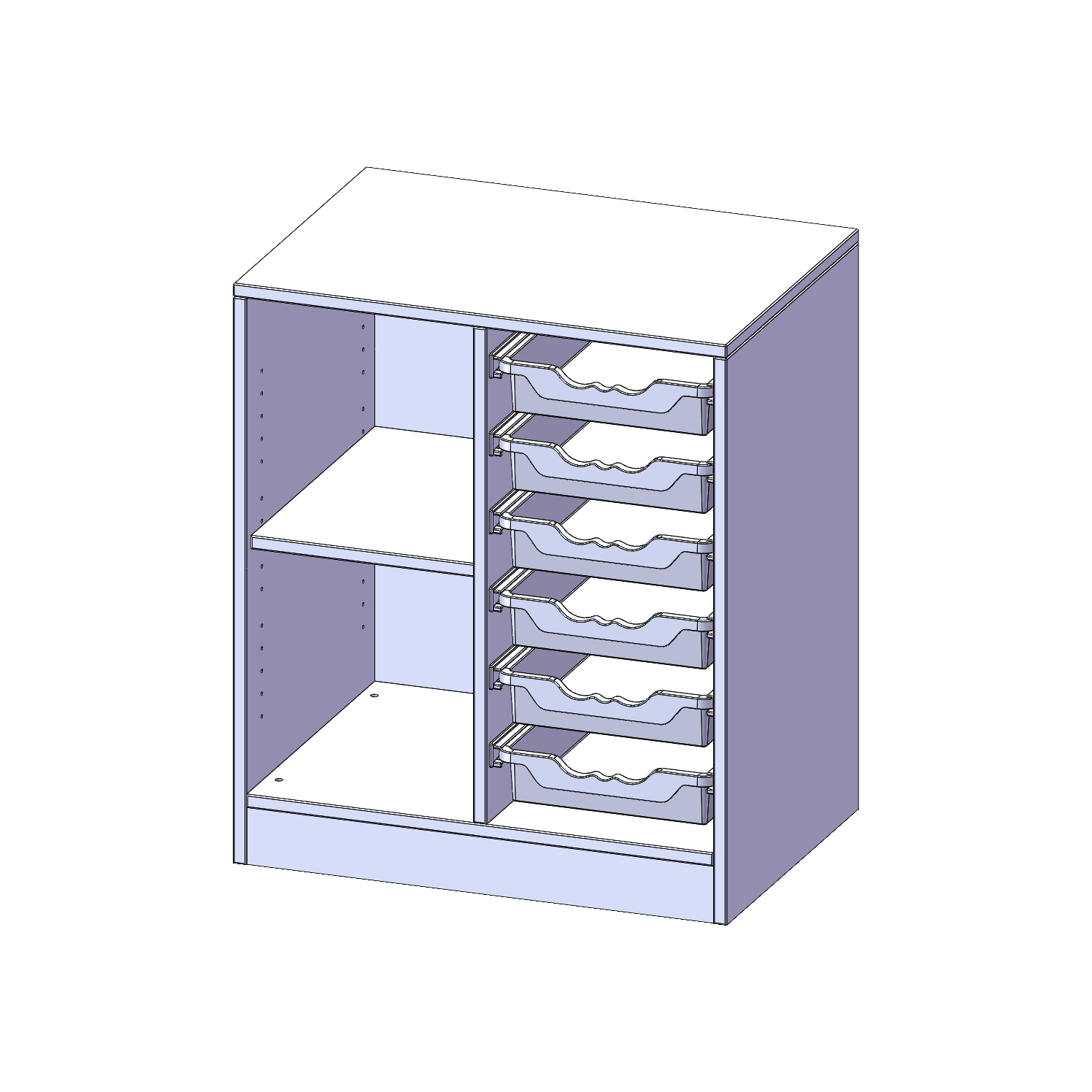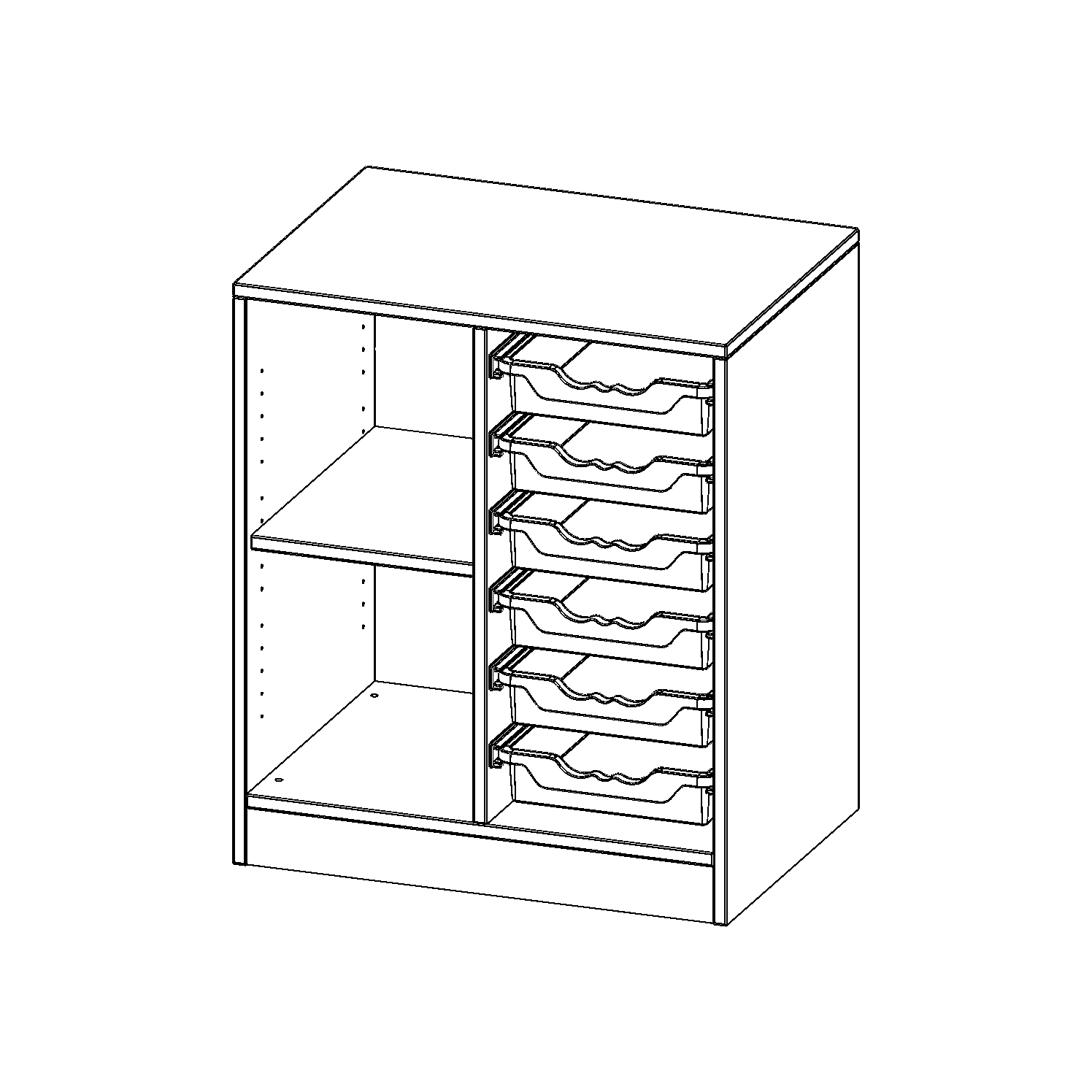 B/H/T: 70,3x82x50 cm, mit Sockel (81 mm), links 2 Fächer, rechts 6 flache ErgoTray Boxen