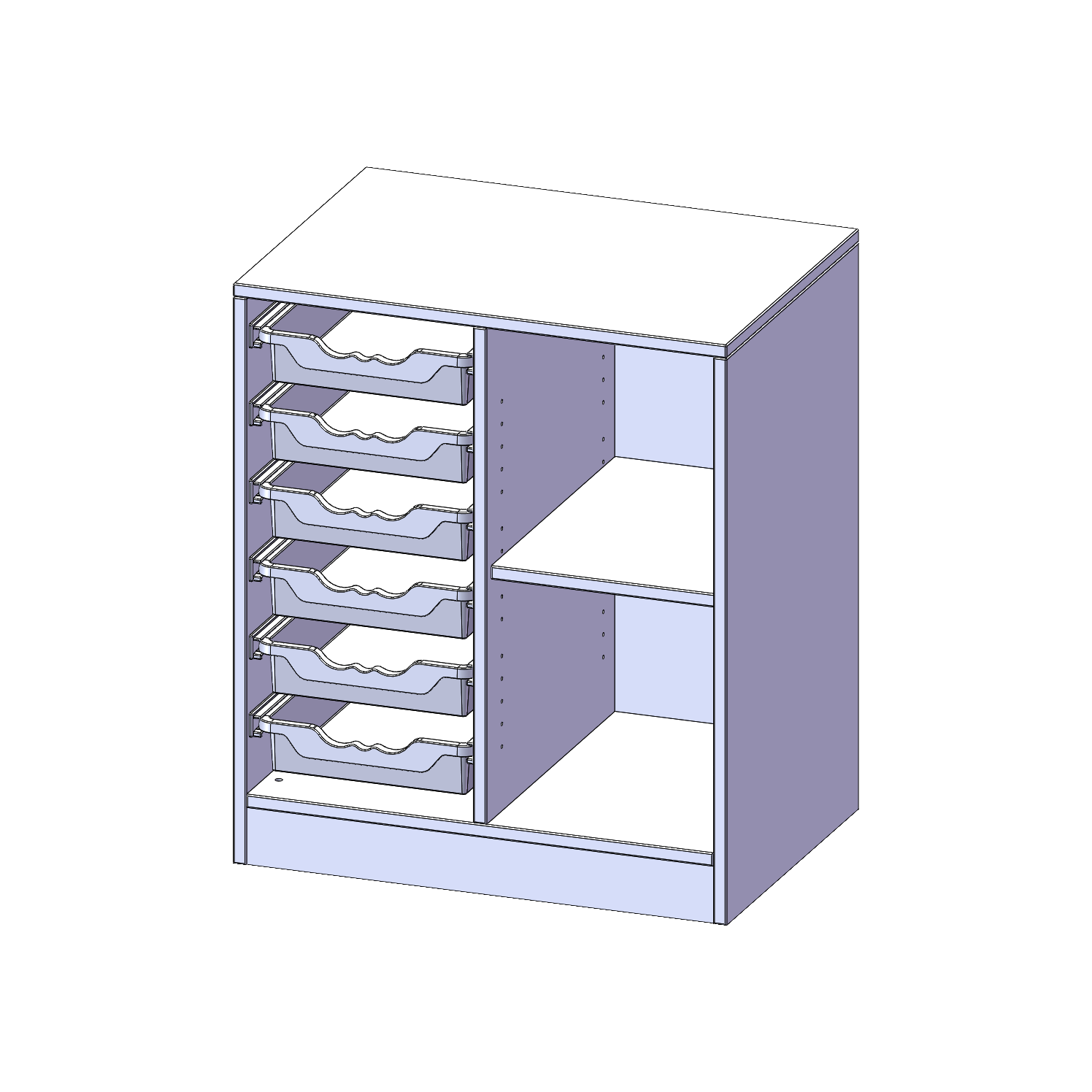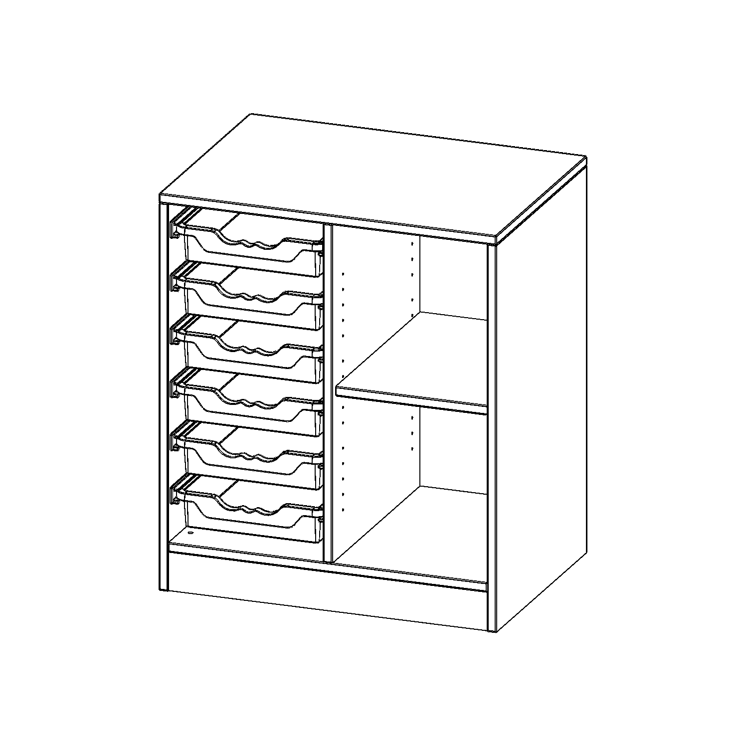 B/H/T: 70,3x82x50 cm, mit Sockel (81 mm), rechts 2 Fächer, links 6 flache ErgoTray Boxen