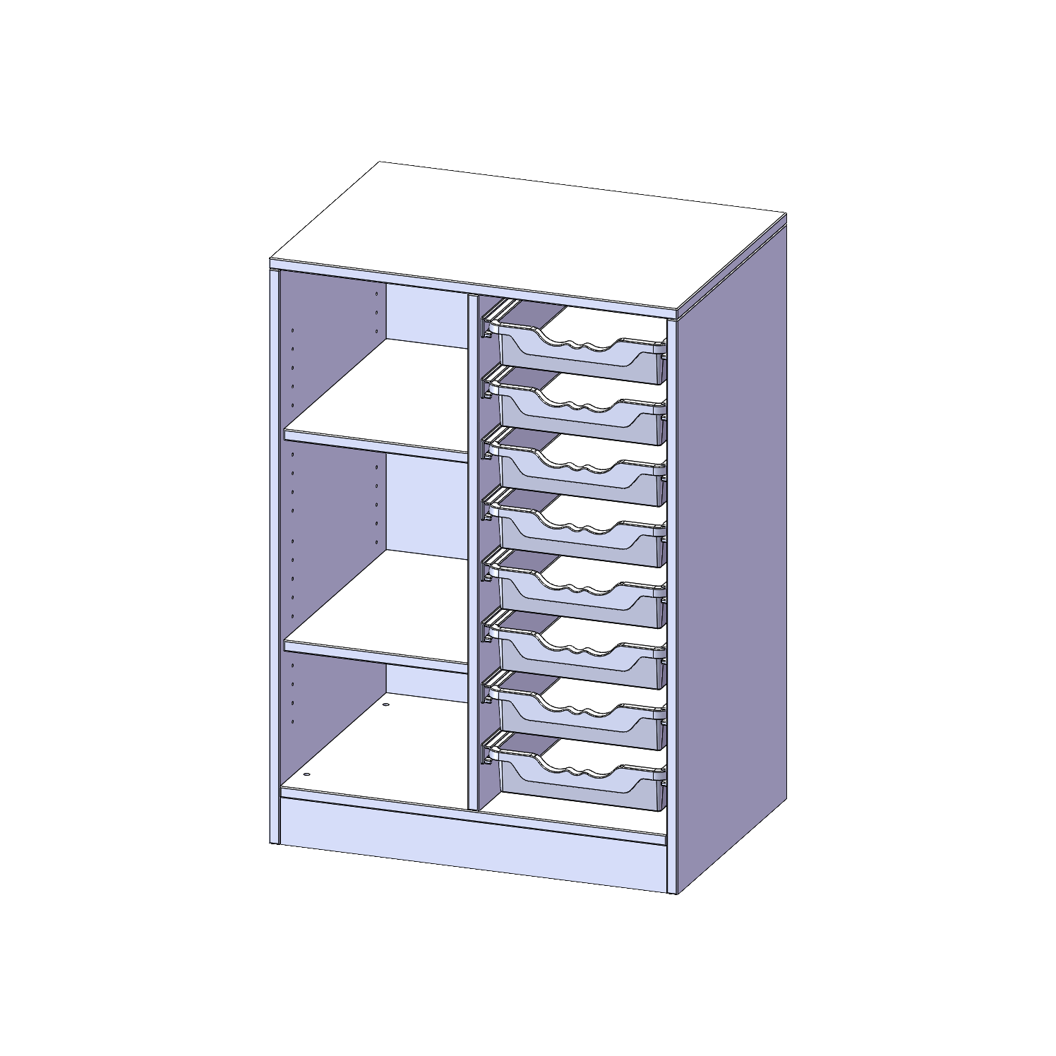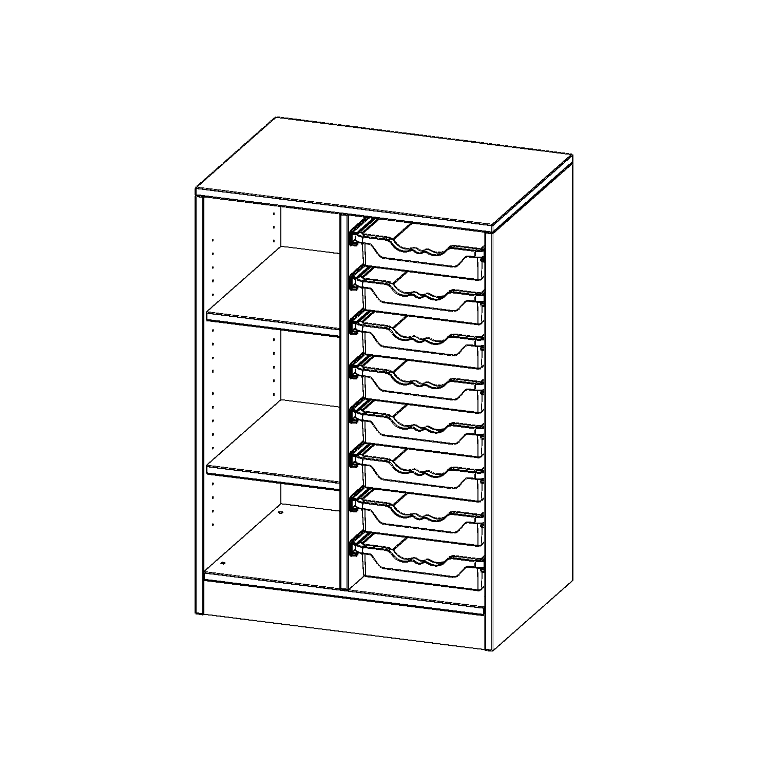 B/H/T: 70,3x100x50 cm, mit Sockel (81 mm), links 3 Fächer, rechts 8 flache ErgoTray Boxen