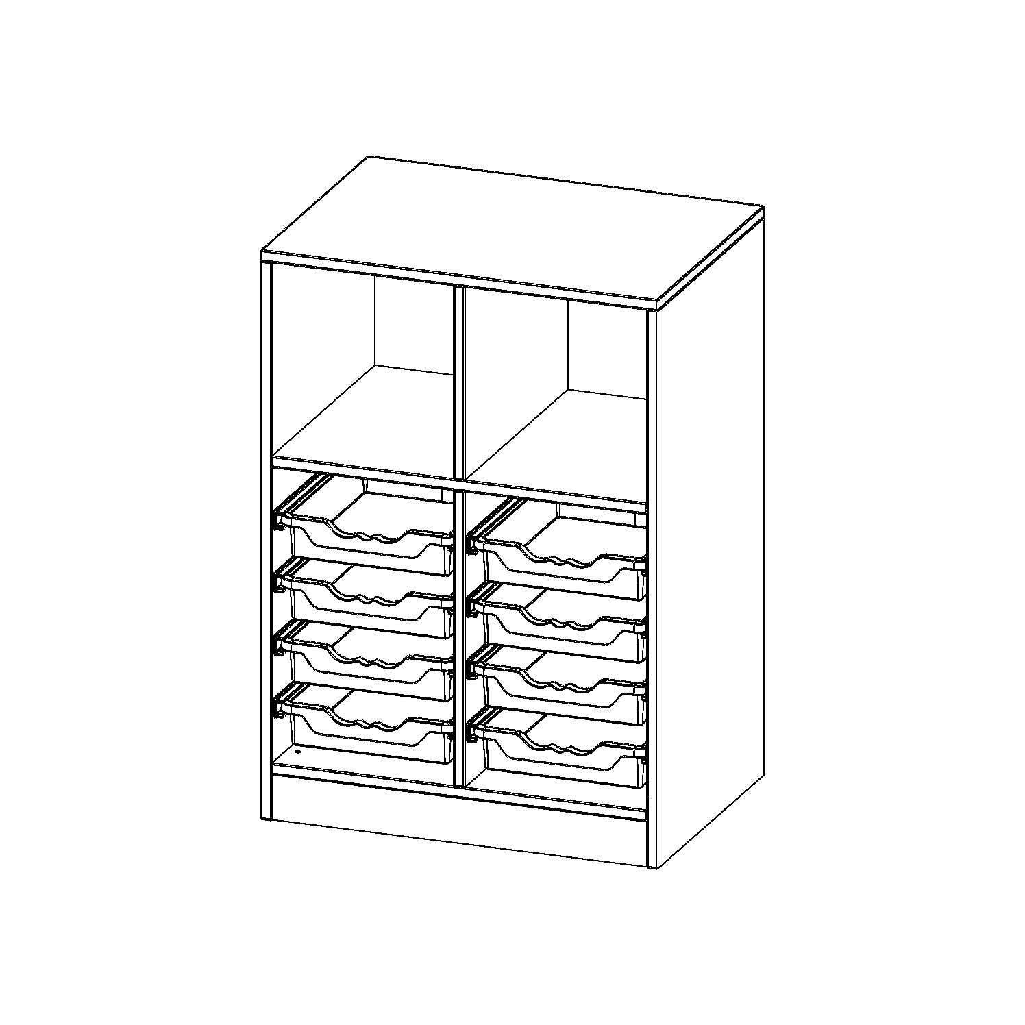 B/H/T: 70,3x100x50 cm, mit Sockel (81 mm), oben 3 Fächer, unten 8 flache ErgoTray Boxen