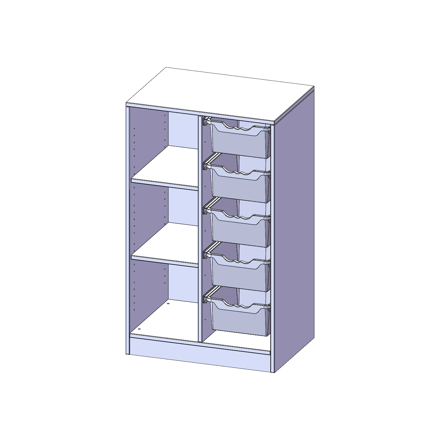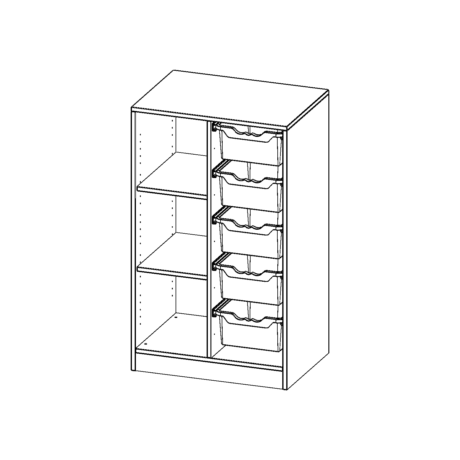 B/H/T: 70,3x118x50 cm, mit Sockel (81 mm), links 3 Fächer, rechts 5 hohe ErgoTray Boxen