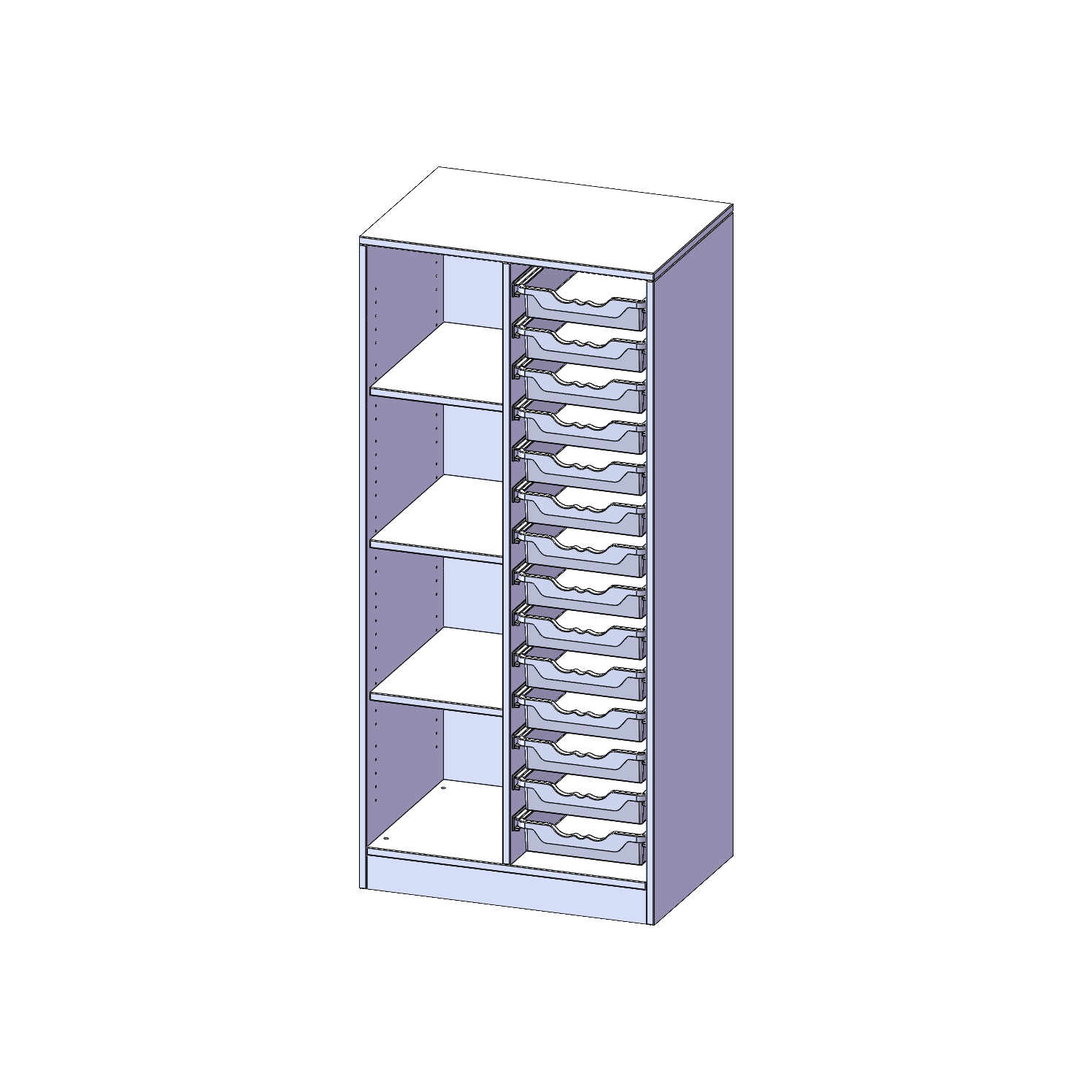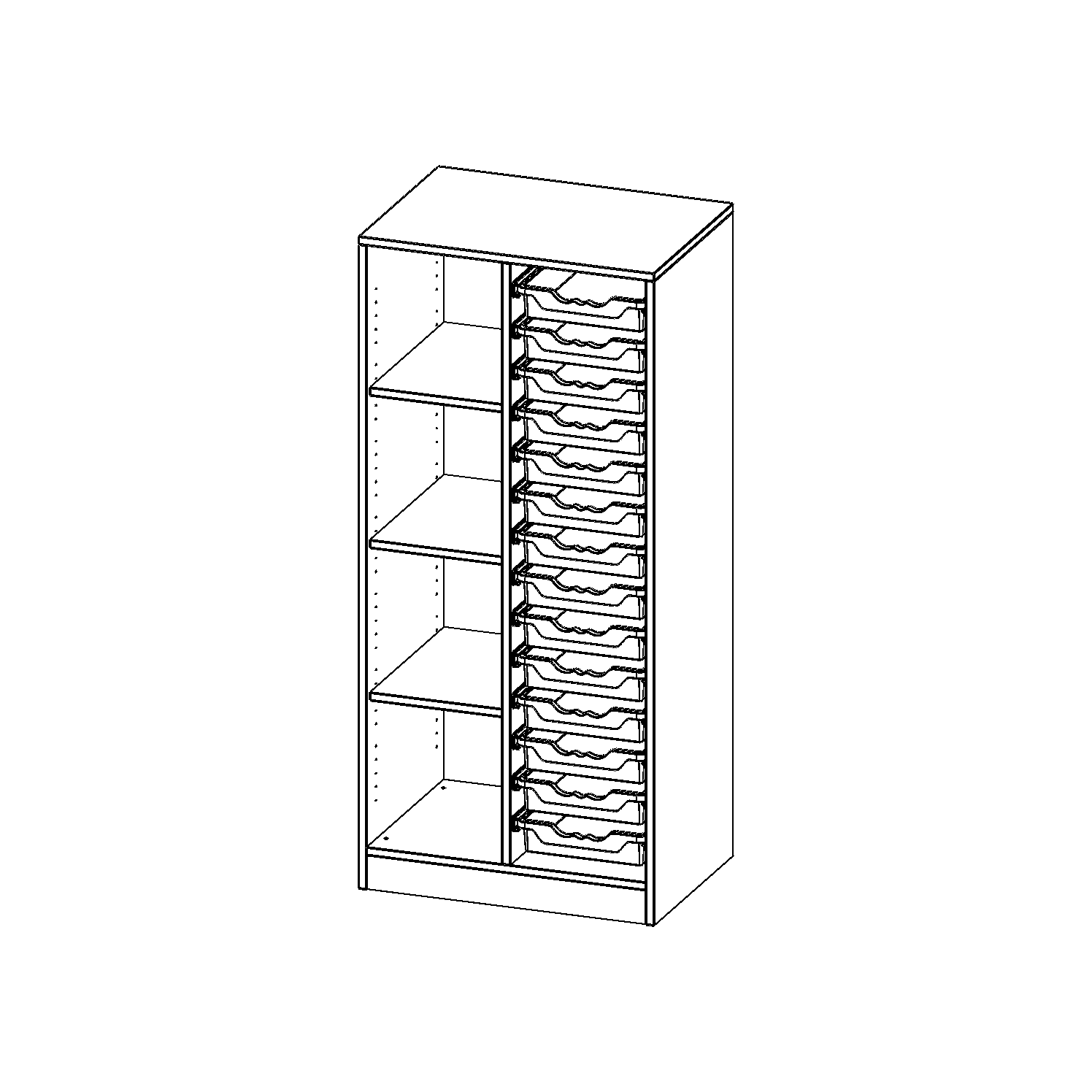 B/H/T: 70,3x154x50 cm, mit Sockel (81 mm), links 4 Fächer, rechts 14 flache ErgoTray Boxen