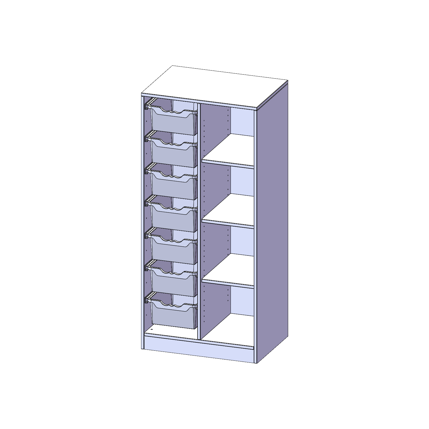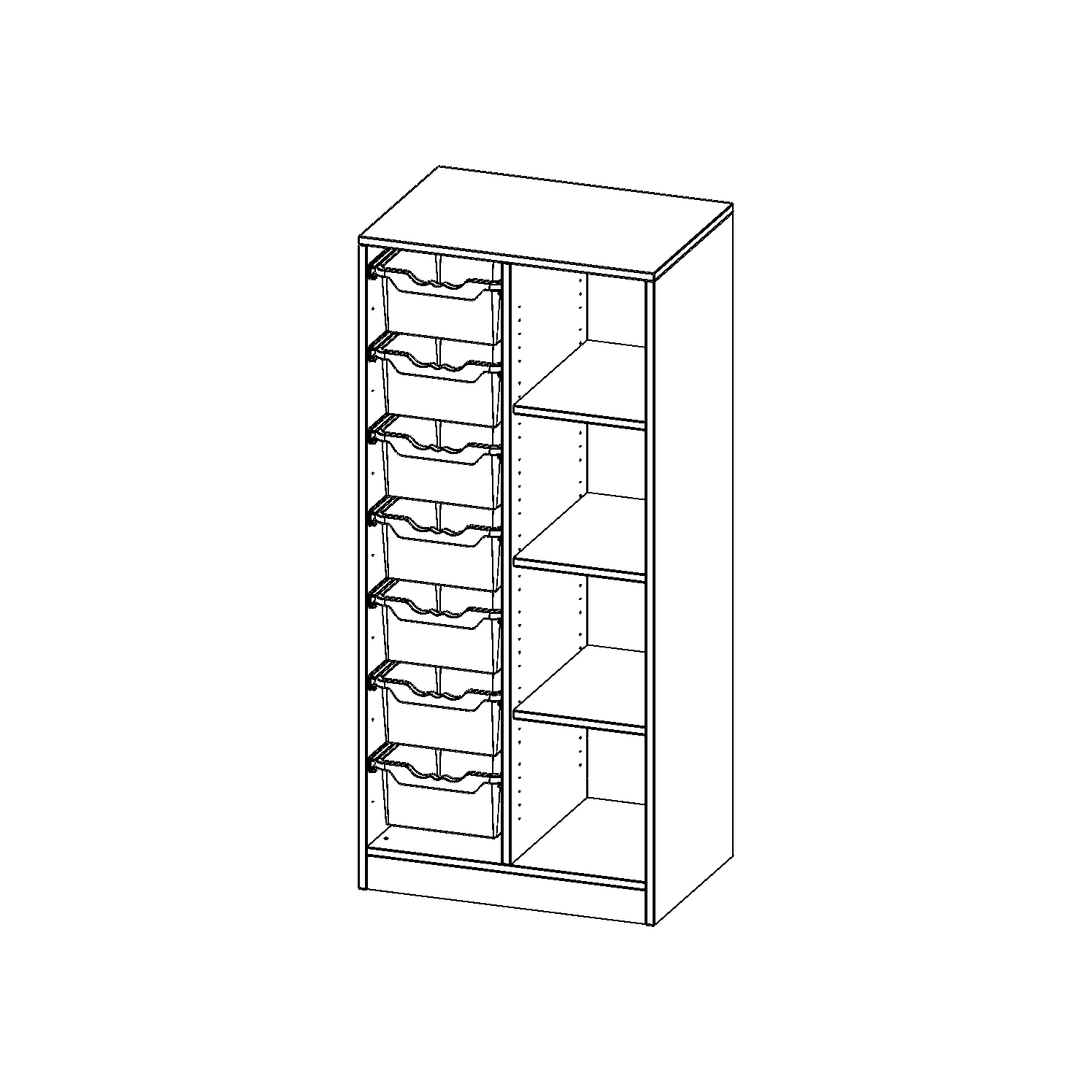 B/H/T: 70,3x154x50 cm, mit Sockel (81 mm), rechts 4 Fächer, links 7 hohe ErgoTray Boxen