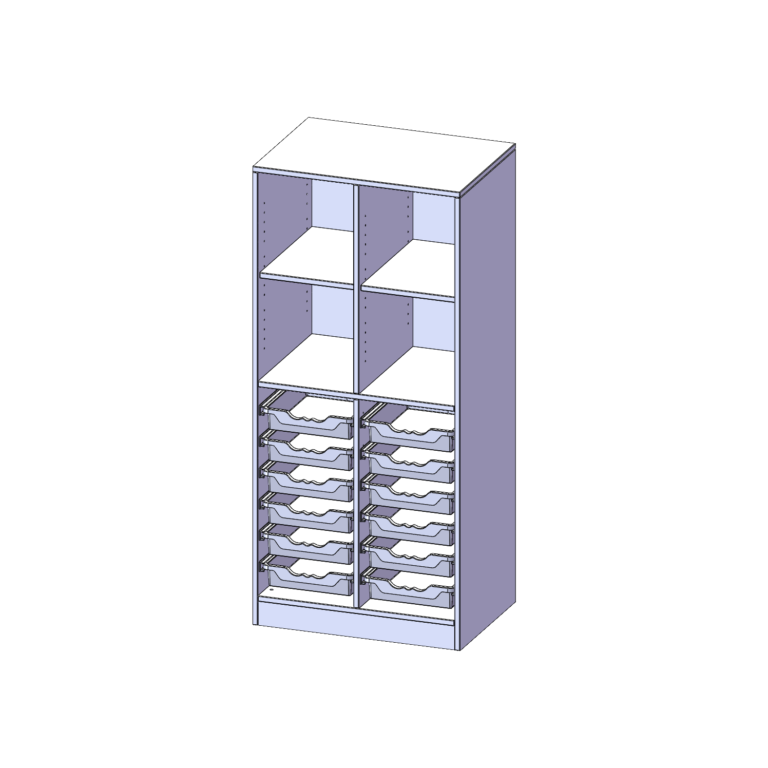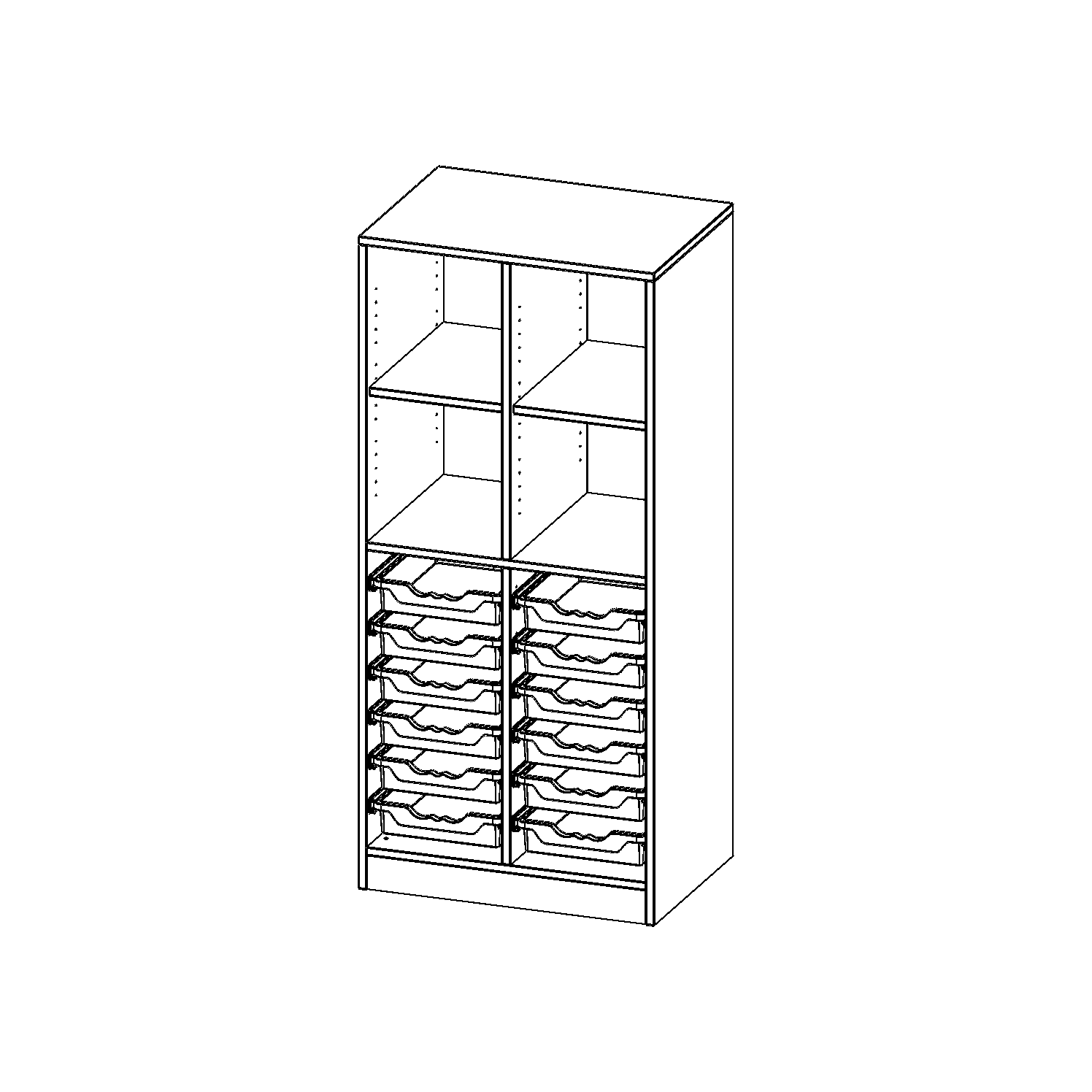 B/H/T: 70,3x154x50 cm, mit Sockel (81 mm), oben 4 Fächer, unten 12 flache ErgoTray Boxen
