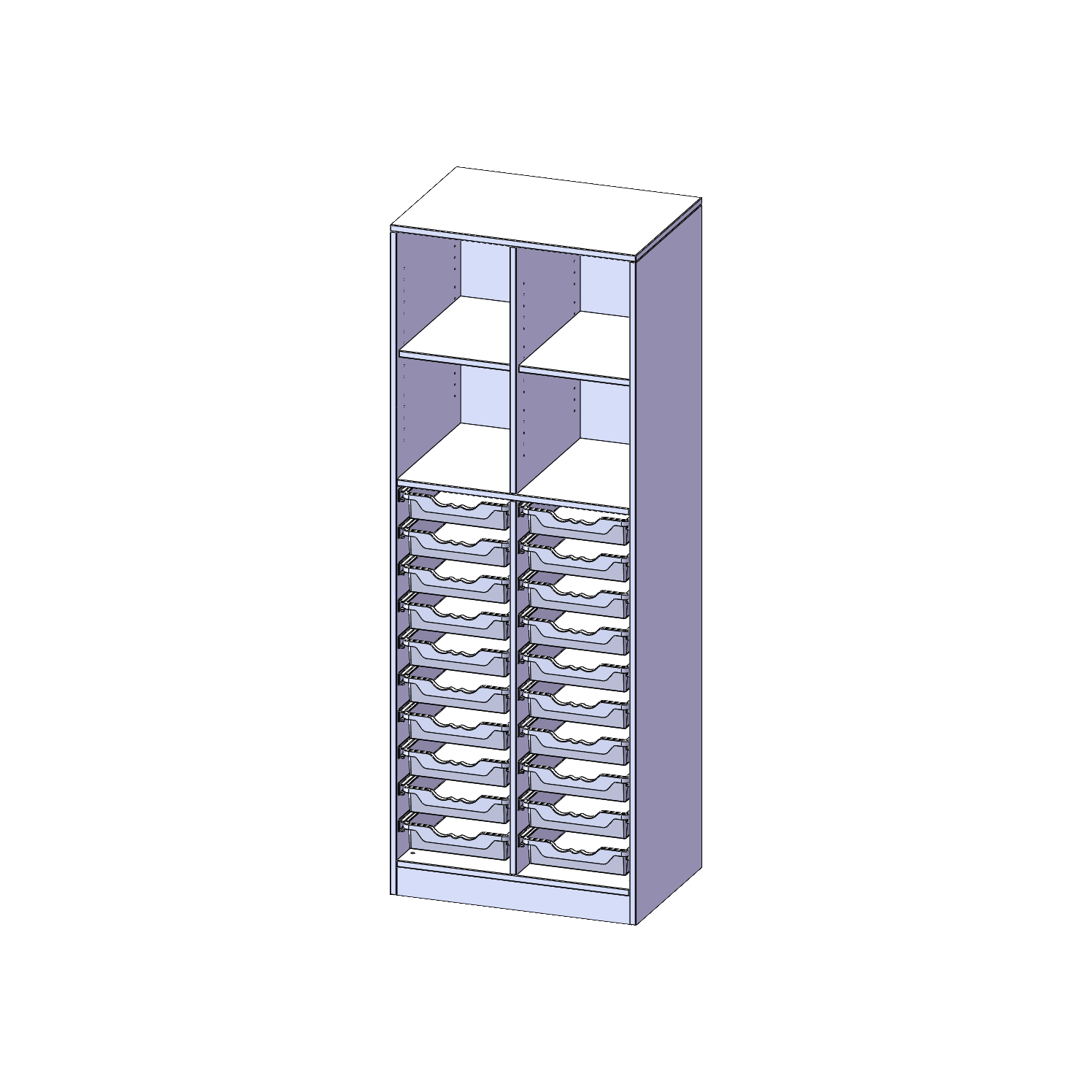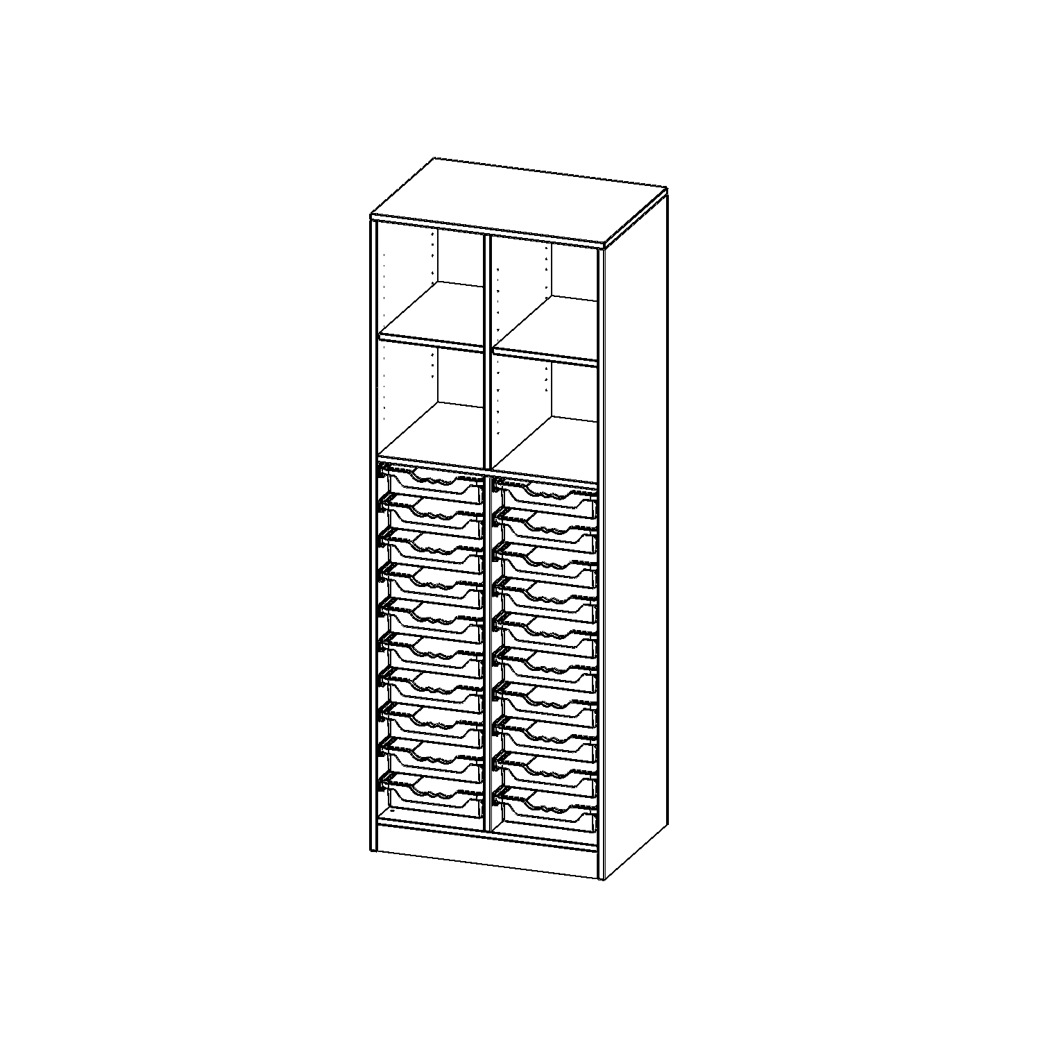 B/H/T: 70,3x190x50 cm, mit Sockel (81 mm) und Mittelwand, unten 20 flache ErgoTray Boxen, oben 4 Einlegeböden