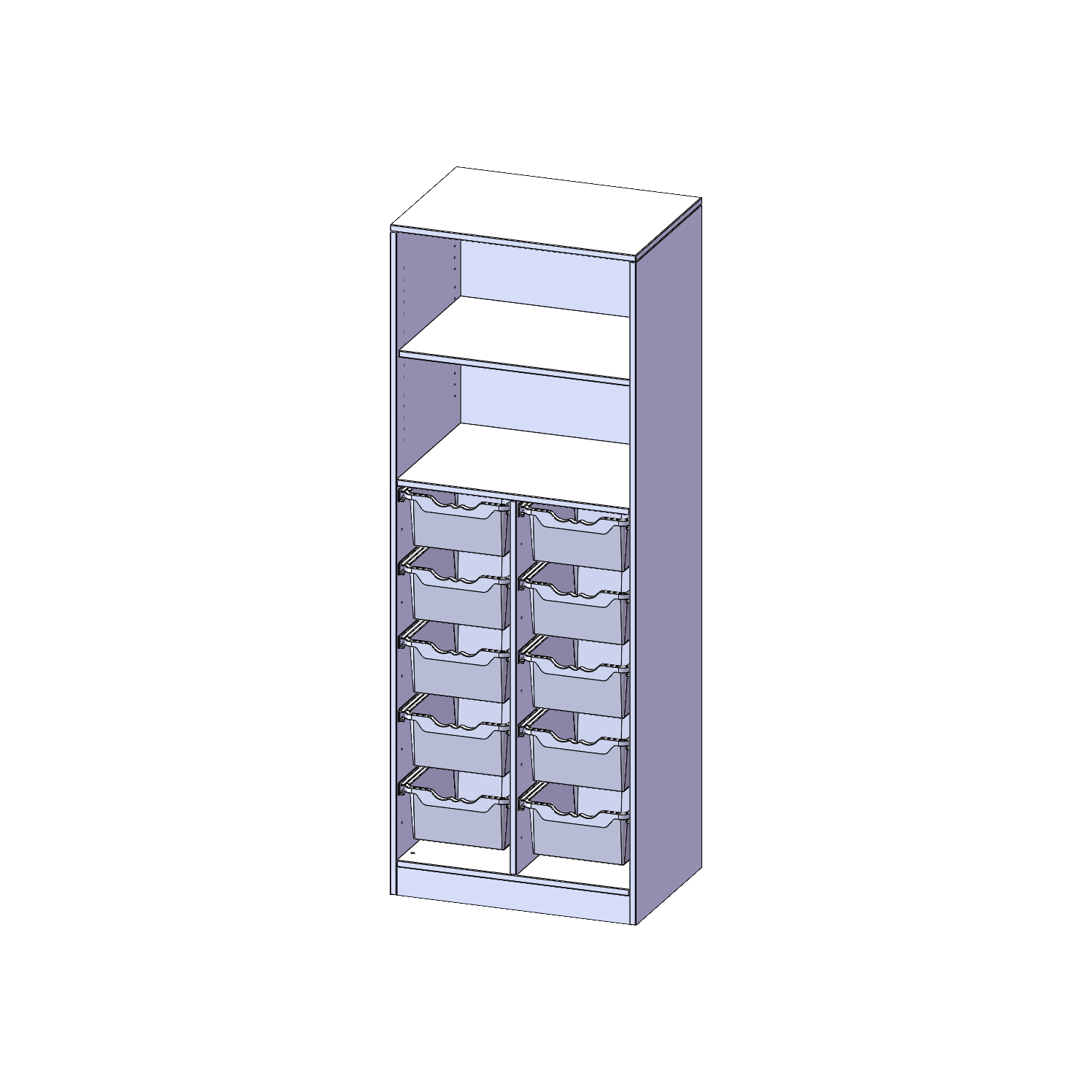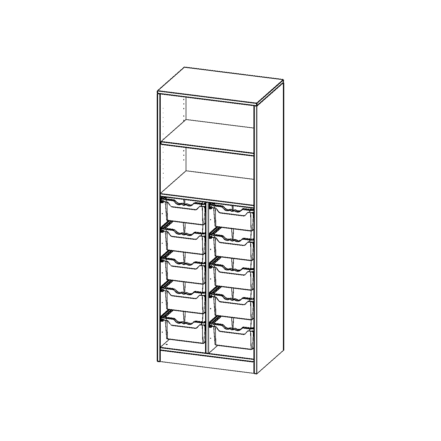 B/H/T: 70,3x190x50 cm, mit Sockel (81 mm), unten 10 hohe ErgoTray Boxen, oben 2 Einlegeböden