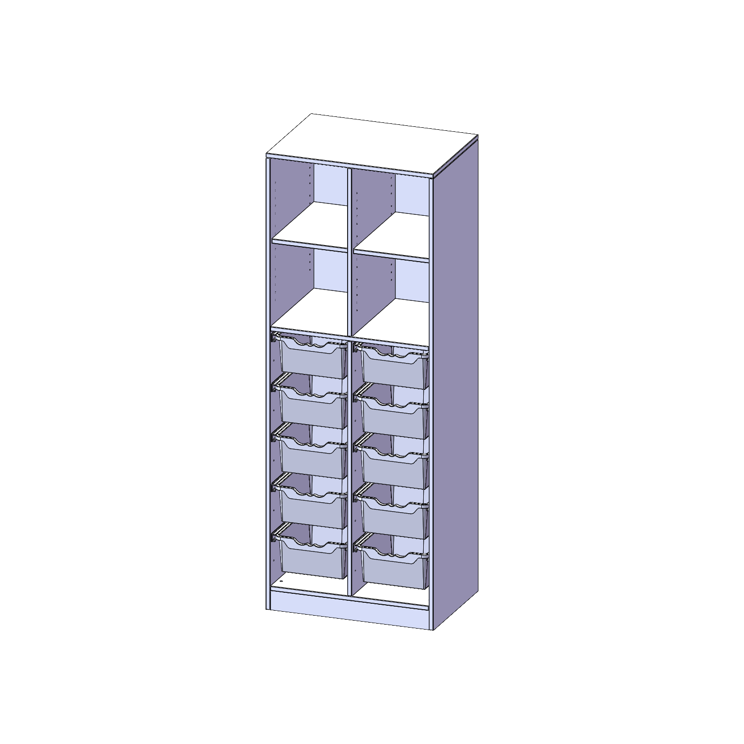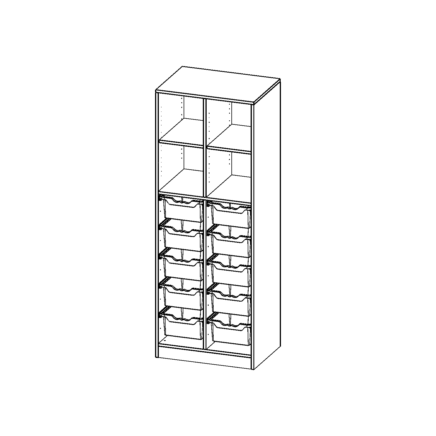 B/H/T: 70,3x190x50 cm, mit Sockel (81 mm) und Mittelwand, unten 10 hohe ErgoTray Boxen, oben 2 Einlegeböden