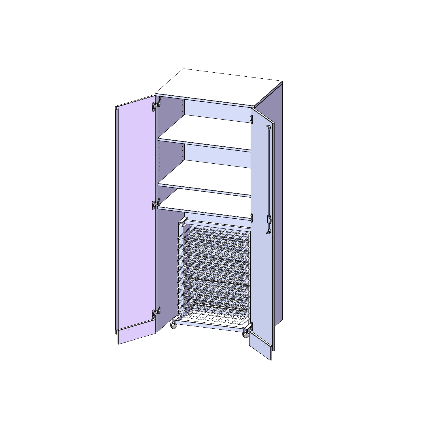 Unsere Garagenschränke bieten wir in verschiedenen Breiten und Ausstattungsvarianten an. Diese Schränke besitzen Türen mit Sockelblenden, damit die Optik der evo-Möbel durchgehend gewahrt wird und sich die eingeschobenen Wagen und Container trotzdem aus dem Schrank fahren lassen. Innen stehen praktische Rollcontainer oder Trockenwagen, die Sie bei Bedarf einfach aus dem Schrank herausrollen und dort verwenden können, wo Sie diese gerade benötigen. Nach dem Unterricht einfach wieder in den Schrank schieben und im Nu ist alles aufgeräumt. Um die Stabilität dieser Schrankkonstruktion zu garantieren, ist im Garagenbereich ein 3seitiger Stahlrahmen verbaut. Die Bauweise bedingt die zerlegte Anlieferung des Schrankes, die Korpusmontage muss vor Ort erfolgen.