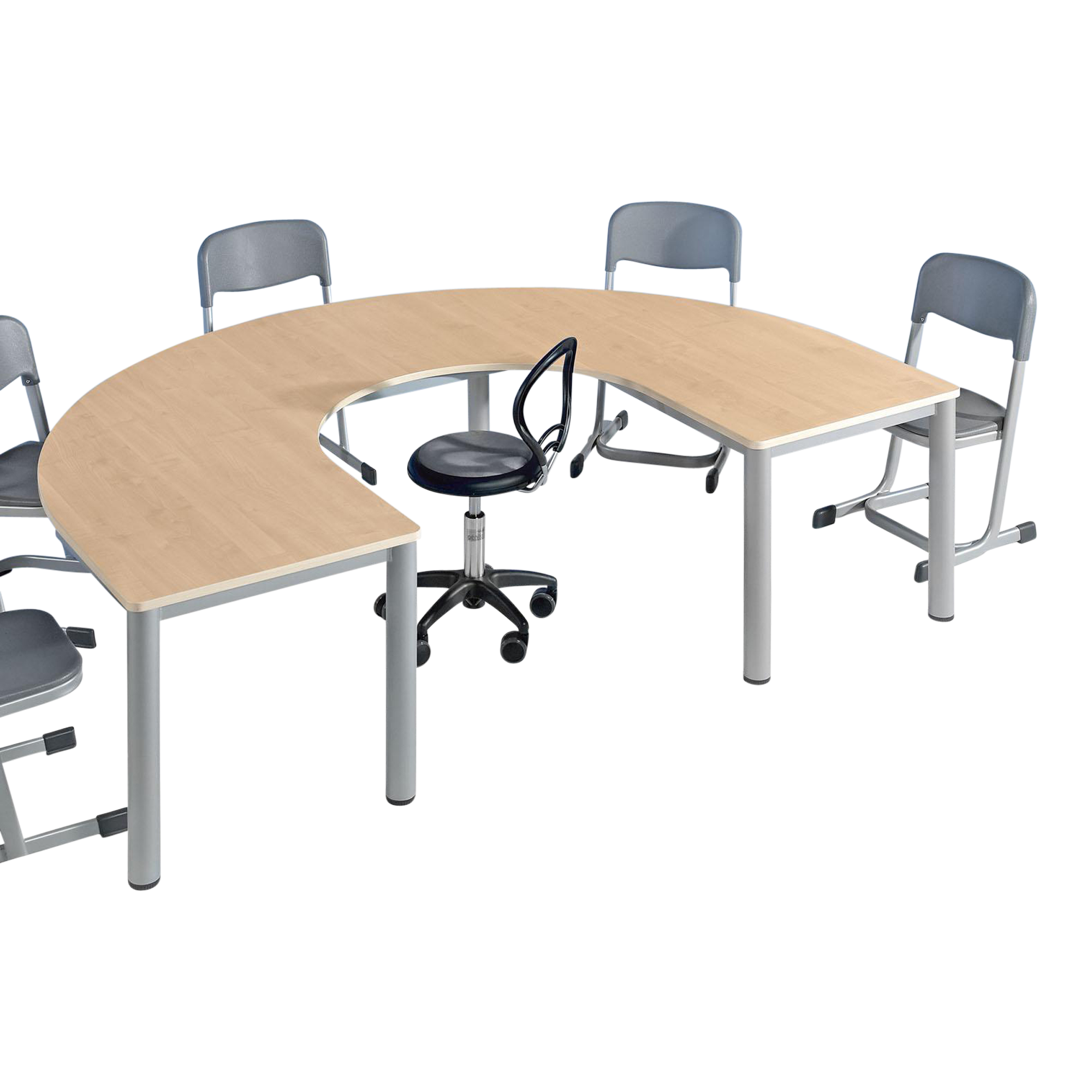 Der Hufeisentisch überzeugt mit einem robusten, pulverbeschichteten Rundrohrgestell und einer strapazierfähigen Tischplatte aus melaminharzbeschichteter Spanplatte, die mit einer stoßfesten ABS-Kante versehen ist. In dieser Ausführung ist der Tisch höhenverstellbar, was ihn besonders flexibel und anpassungsfähig macht. Unser Hufeisentischsystem besteht aus drei Grundformen, die Sie beliebig miteinander kombinieren können. Dadurch lassen sich vielfältige Nutzungsmöglichkeiten realisieren, sei es als Arbeits-, Konferenz- oder Spieltisch oder sogar als ganze Tischlandschaften für Aufenthaltsräume. Dieses vielseitige und funktionale Design macht den Hufeisentisch zu einer idealen Wahl für unterschiedliche Einsatzbereiche.