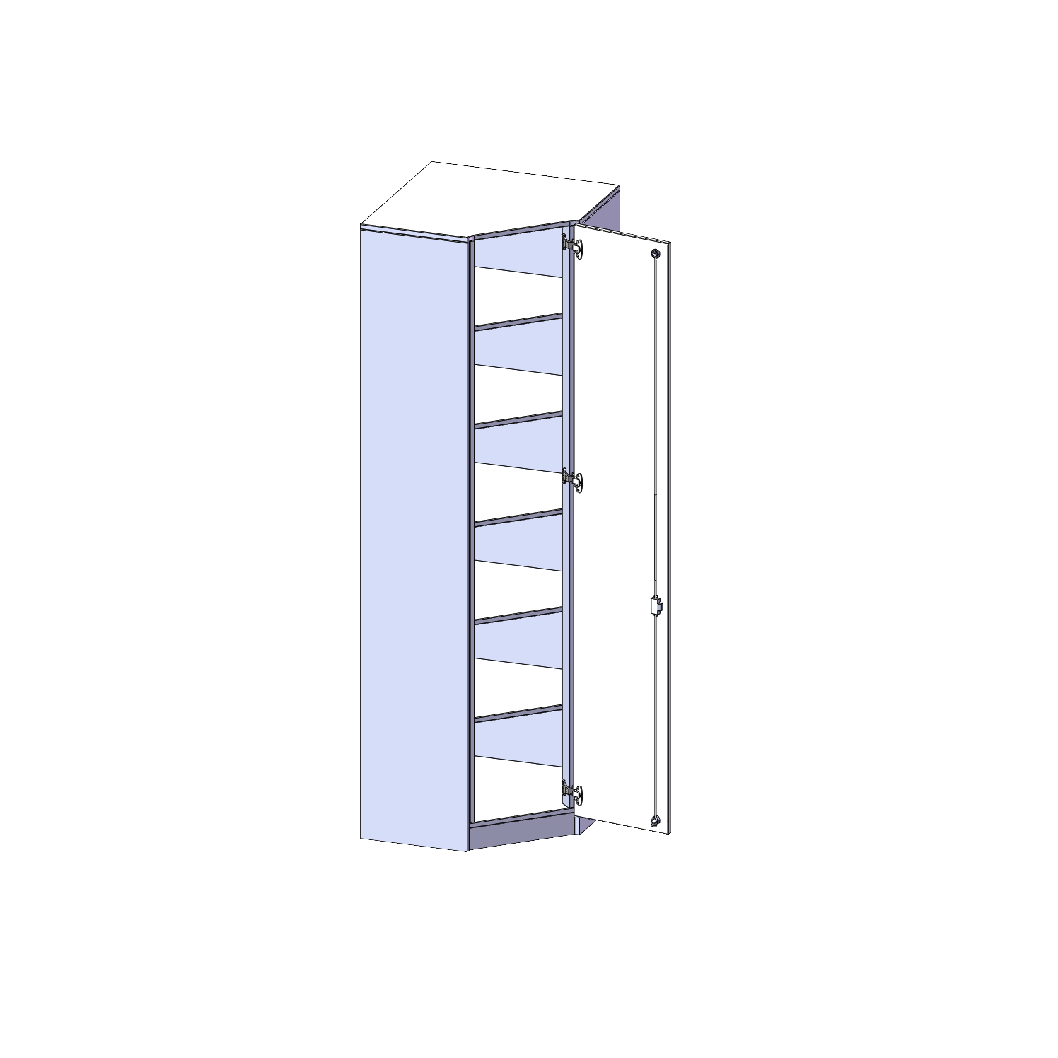 Alle Innenneckschränke werden aus melaminharzbeschichteter E1-Feinspanplatte gefertigt, die FSC zertifiziert und formaldehydfrei sind. Als Kanten verwenden wir besonders robuste 2 mm starke ABS Kanten, die unter hoher Temperatur fest verleimt werden. Bitte wählen Sie Ihr Wunschdekor aus unserer Dekorpalette aus. Die Einlegeböden sind im Raster von 32 mm verstellbar. Unsere hochwertigen Bodenträger verfügen über einen "Ausziehstop", so wird verhindert, dass Böden mit Inhalt darauf aus dem Regal oder Schrank rutschen können.