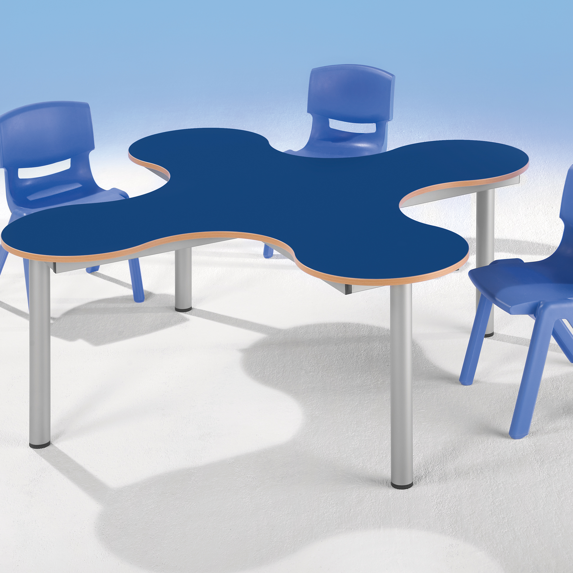 Die Tischplatte des Kleeblatttisches ist aus einer 19 mm starken, melaminharzbeschichteten Spanplatte in der umweltfreundlichen E1 Qualität hergestellt. Sie ist besonders leicht zu reinigen und kann feucht abgewischt werden.