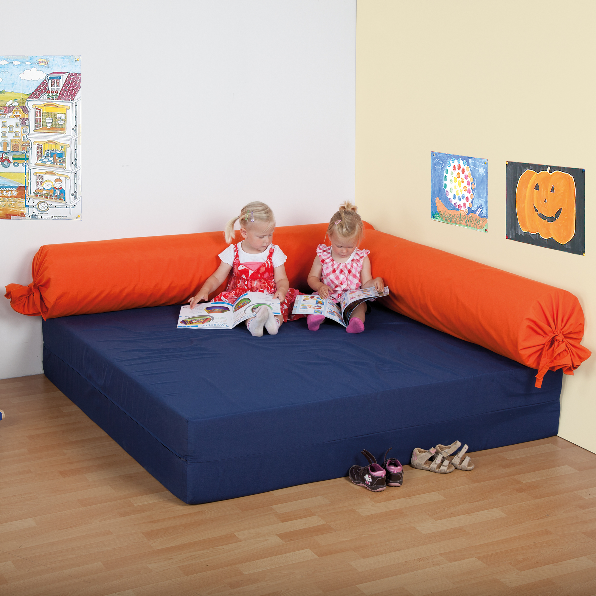 Die 3-teilige Kuschelecke besteht aus einem Kuschelecken Quadrat mit durchgehendem Polster und zwei Rückenrollen. Sie bietet großräumigen Platz für uneingeschränktes spielen, toben und entspannen.
