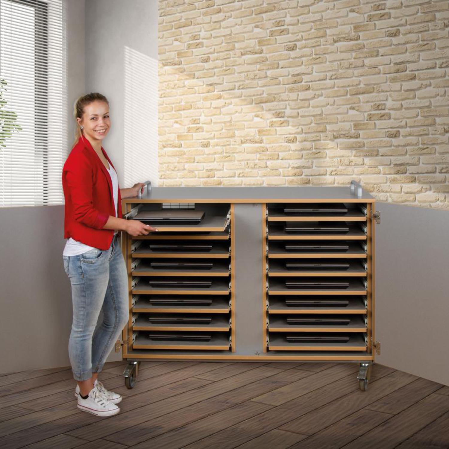Der Laptopwagen hat abschließbare Türen vorne und hinten. Er bietet Platz für 16 Laptops oder 32 Tablet PCs. Steckdosenleisten sind im Laptopwagen eingebaut, so dass die Laptops im Schrank geladen werden können und nur ein Kabel nach draußen geführt wird. Mehrere Lüftungsgitter an der Rückseite sorgen für eine ausreichende Luftzirkulation. Die Innenfächer sind passend für Geräte bis zu 17 Zoll.