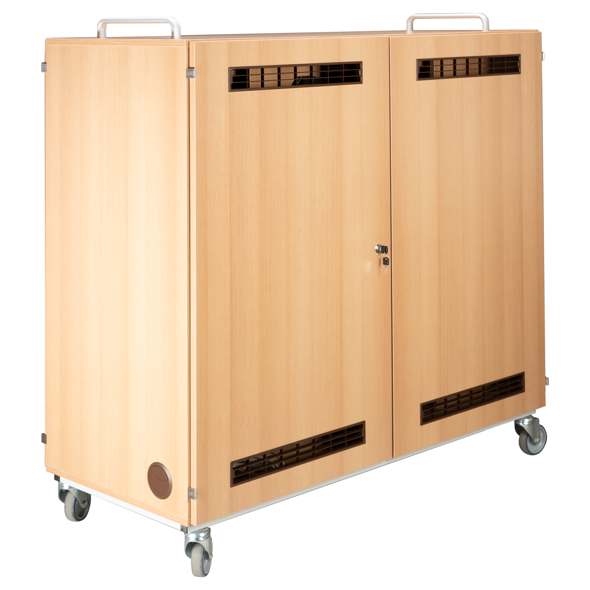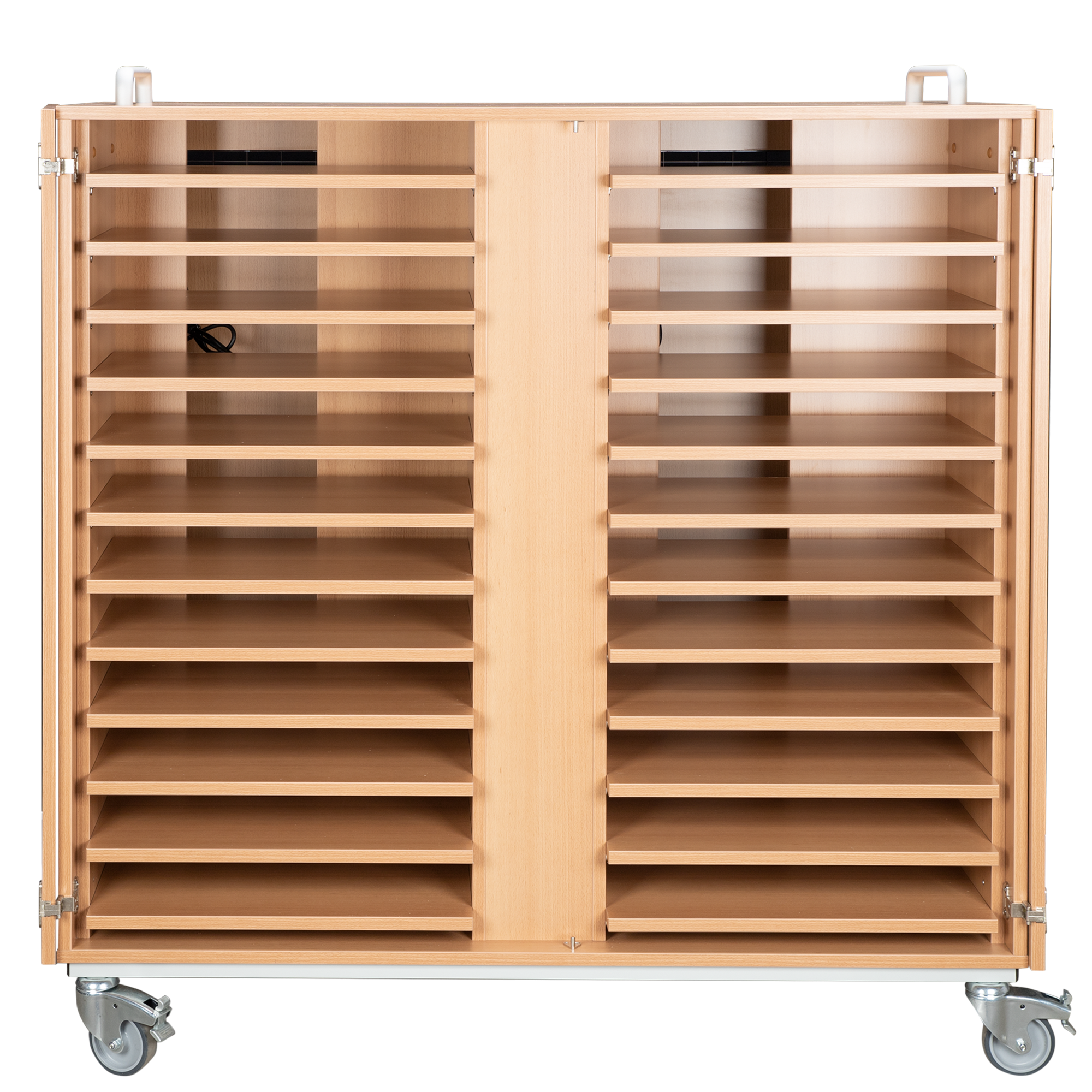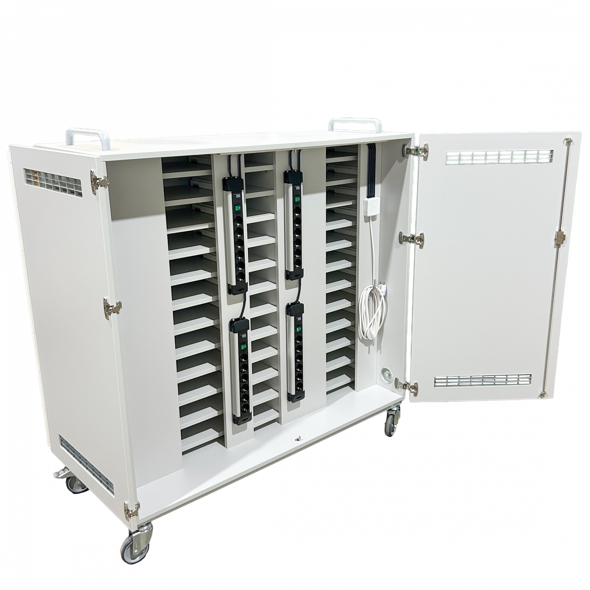Der Laptopwagen hat abschließbare Türen vorne und hinten. Er bietet Platz für 24 Laptops oder 48 Tablet PCs. Steckdosenleisten sind im Laptopwagen eingebaut, so dass die Laptops im Schrank geladen werden können und nur ein Kabel nach draußen geführt wird. Mehrere Lüftungsgitter an der Rückseite sorgen für eine ausreichende Luftzirkulation. Die Innenfächer sind passend für Geräte bis zu 17 Zoll.