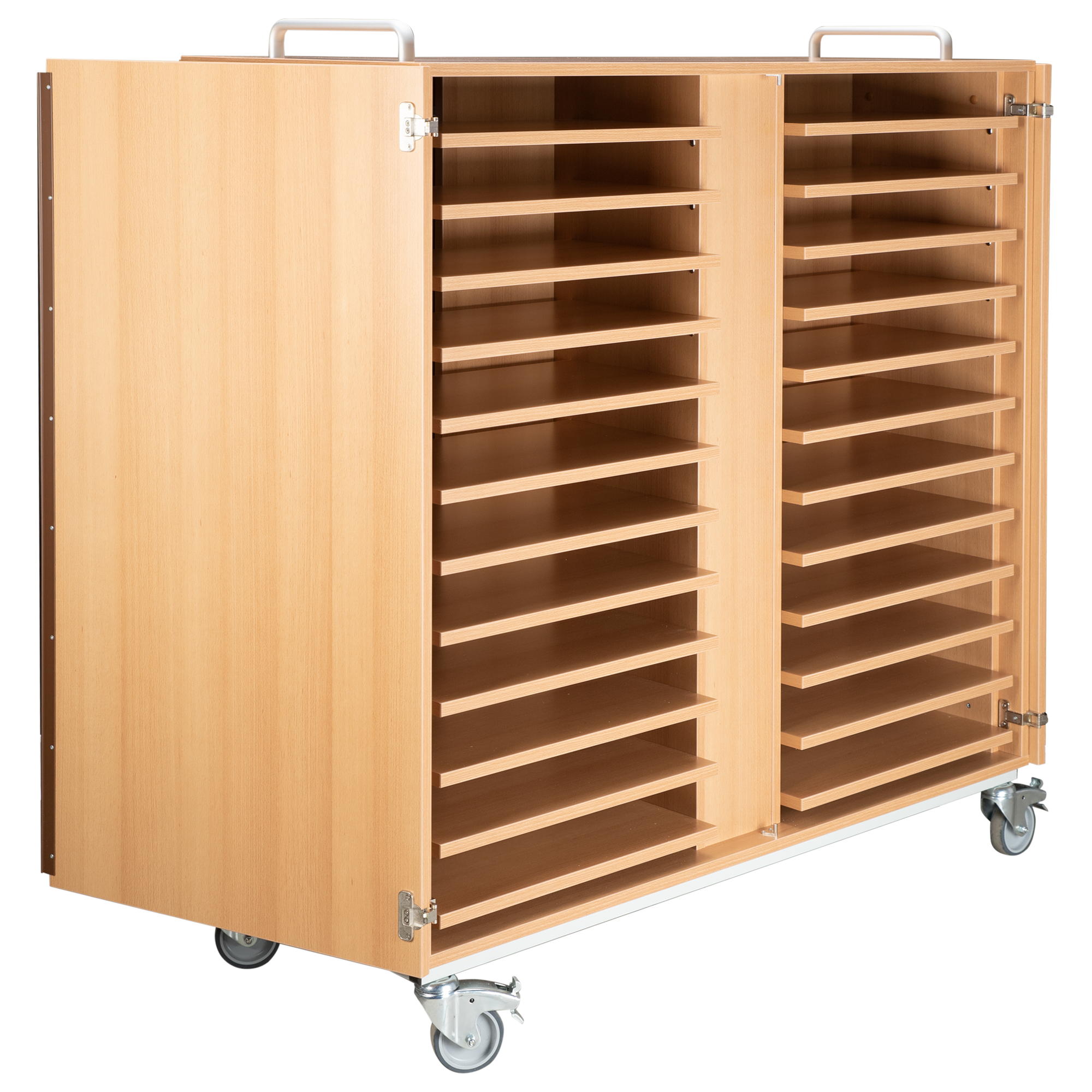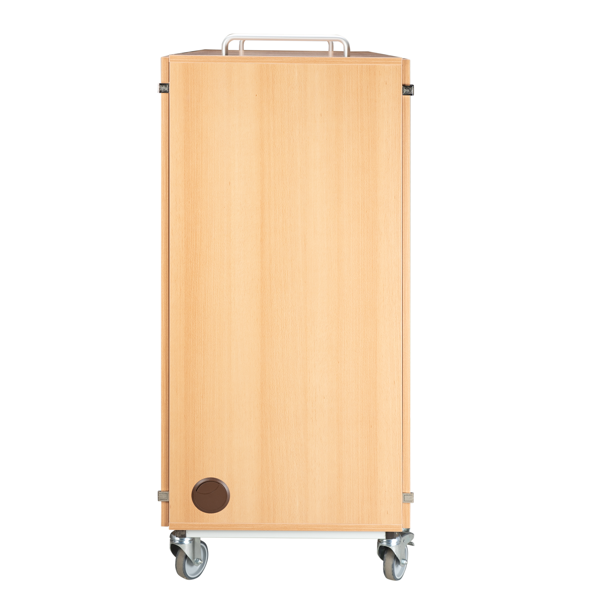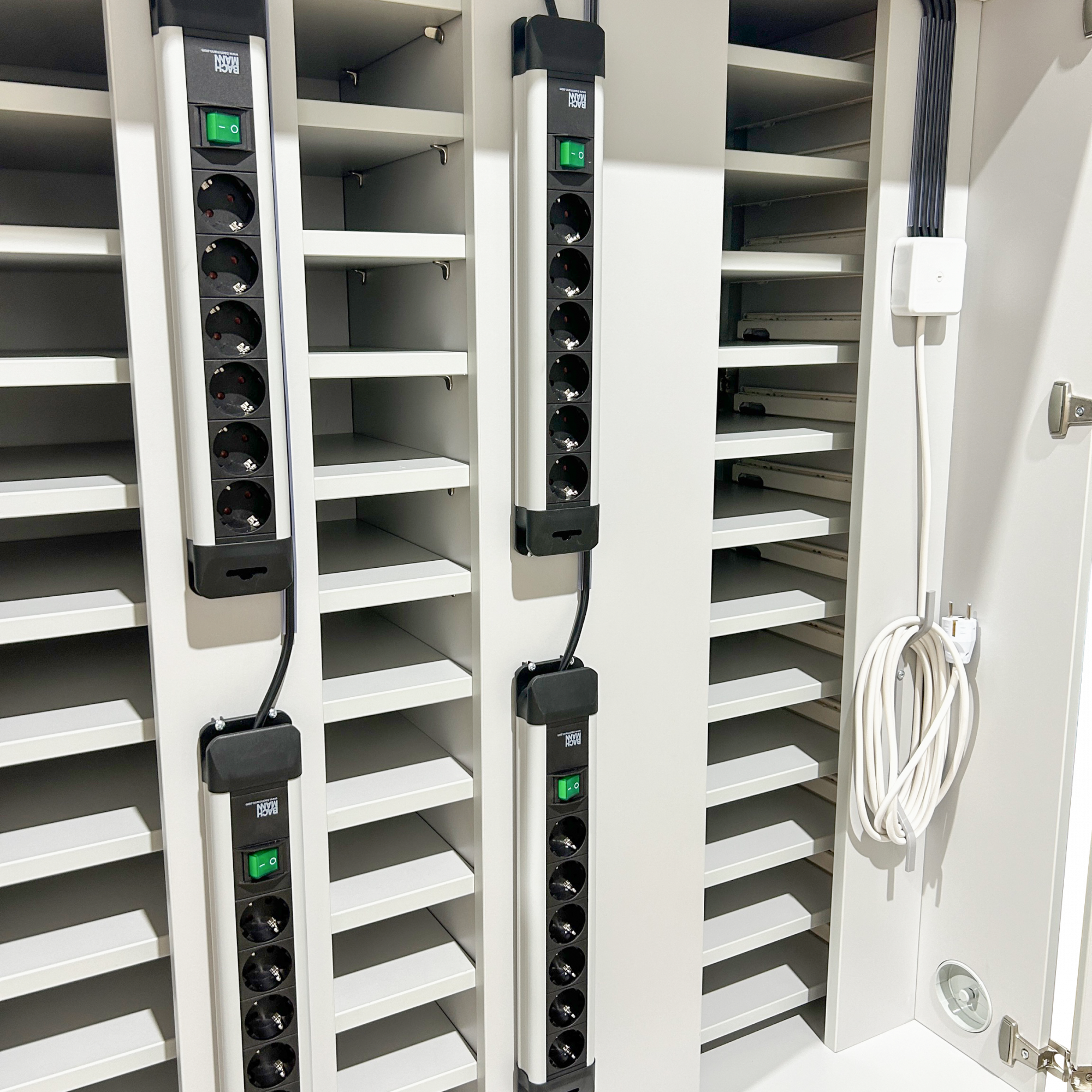 Der Laptopwagen hat abschließbare Türen vorne und hinten. Er bietet Platz für 24 Laptops oder 48 Tablet PCs. Steckdosenleisten sind im Laptopwagen eingebaut, so dass die Laptops im Schrank geladen werden können und nur ein Kabel nach draußen geführt wird. Mehrere Lüftungsgitter an der Rückseite sorgen für eine ausreichende Luftzirkulation. Die Innenfächer sind passend für Geräte bis zu 17 Zoll.