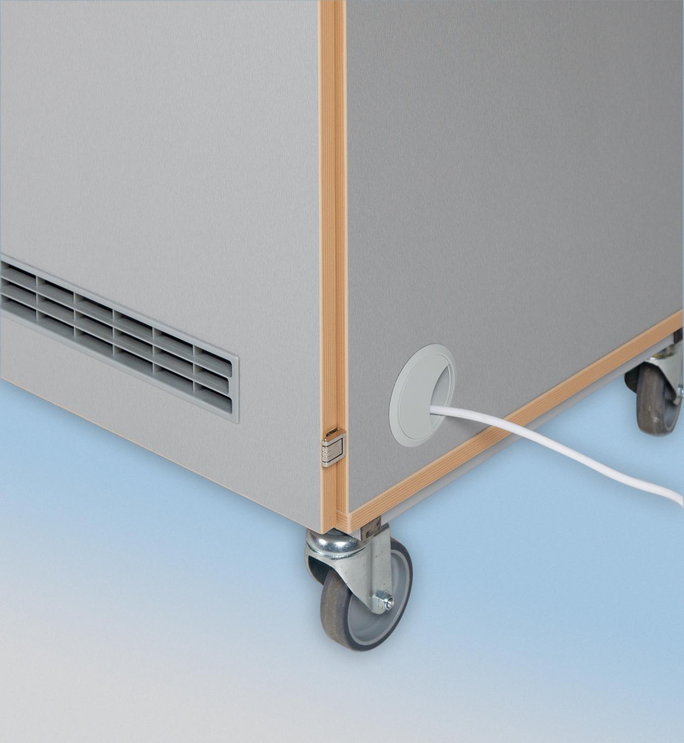 Der Laptopwagen besitzt 4 Schwerlastrollen, von denen 2 feststellbar sind, um den Laptop Trolley am gewünschten Ort zu fixieren.