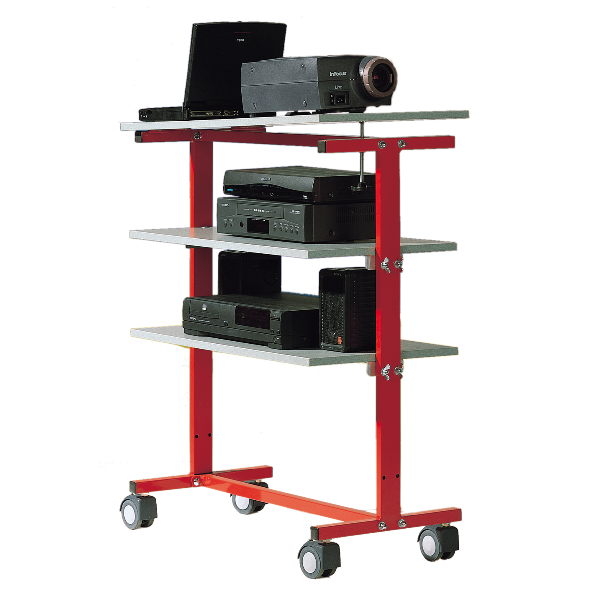 Unser LCD-Projektorwagen ist der perfekte Helfer um alles was benötigt wird kompakt zu verstauen. Oben befindet sich eine Ebene (B/T: 82x45 cm) für Beamer und Laptop.