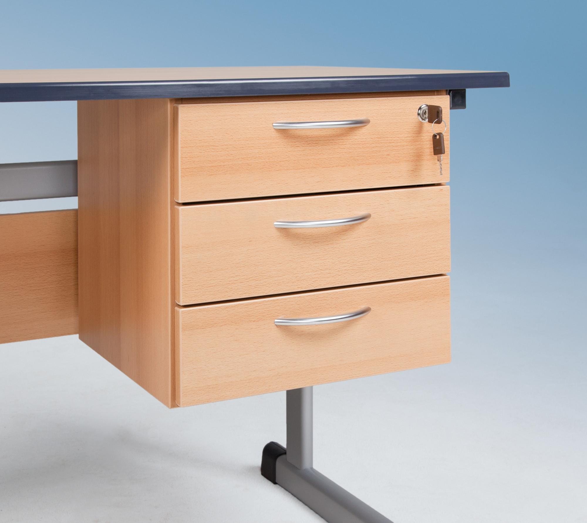 Er ist mit einem Unterbau rechts mit 3 Schüben ausgestattet, durch das Schloß sichert er Lehrmaterialien und persönliche Gegenstände ab, während sein modernes Design sich nahtlos in jedes Klassenzimmer einfügt.