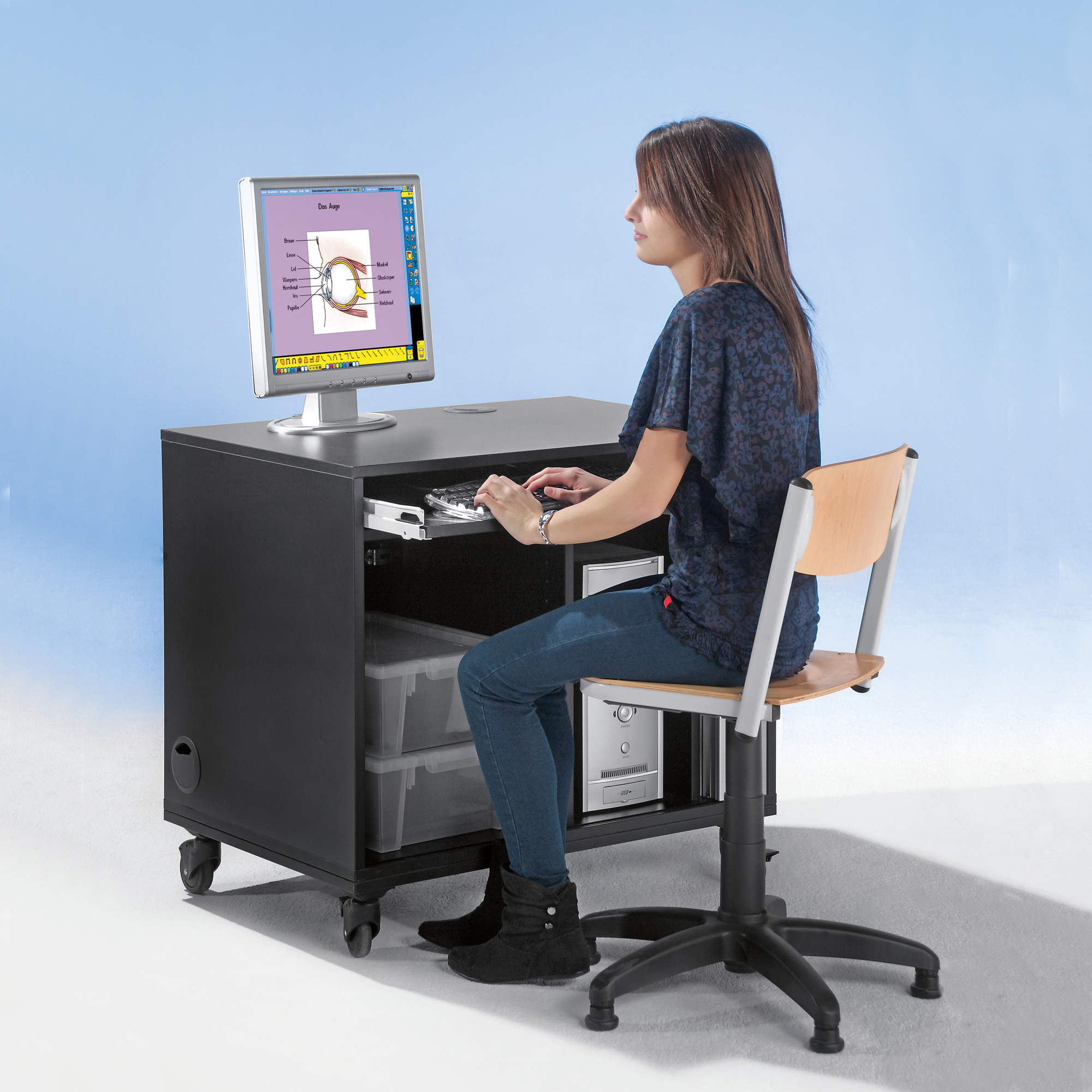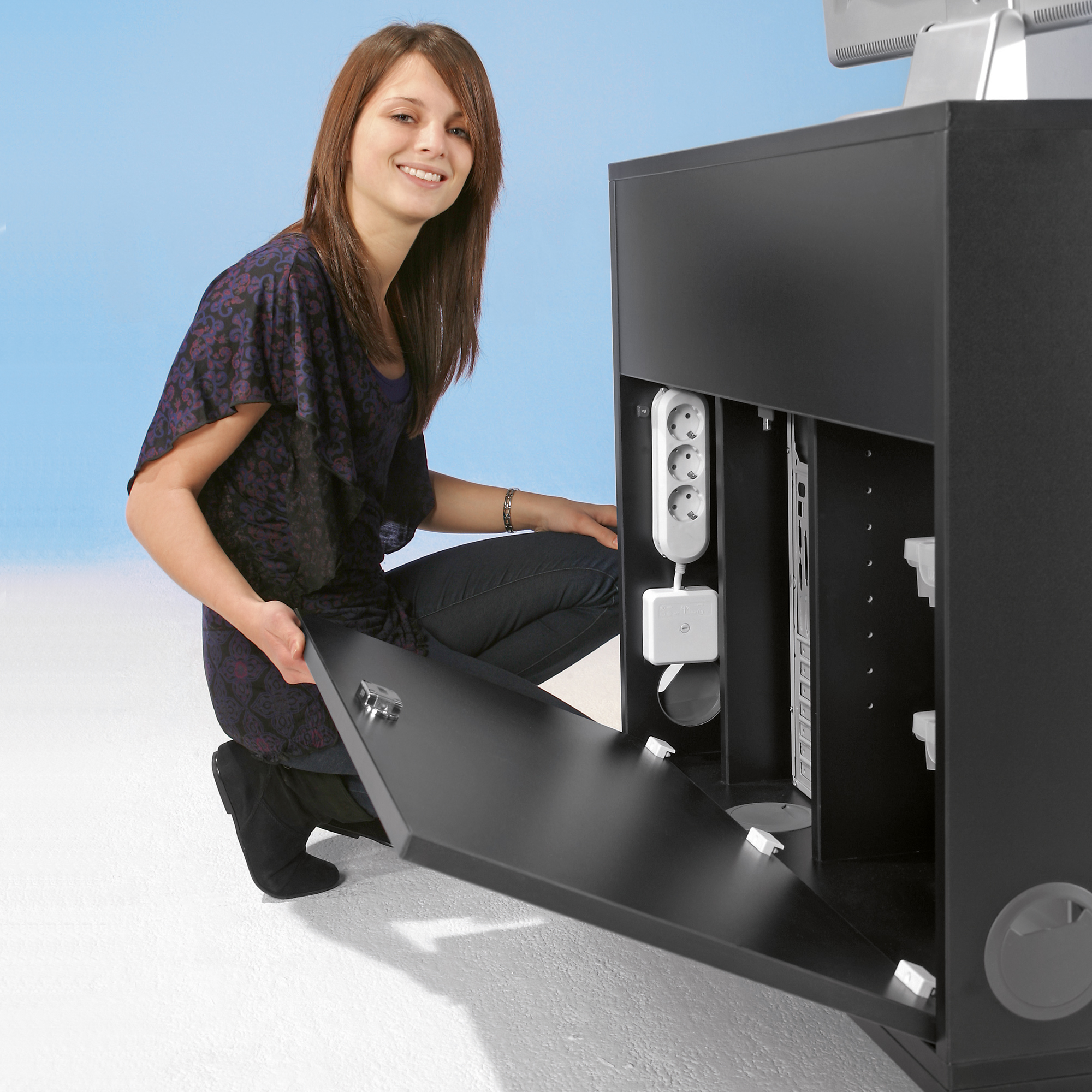 Ein Tastaturauszug befindet sich auf 72 cm Höhe, ideal bei sitzender Tätigkeit. Die Rückwand ist herausnehmbar, so können alle Kabel einfach verkabelt werden. Im inneren befindet sich auch ein extra Fach für den PC-Tower und dank der mitgelieferten 3-fach Steckdose ist auch die Stromzufuhr gewährleistet.