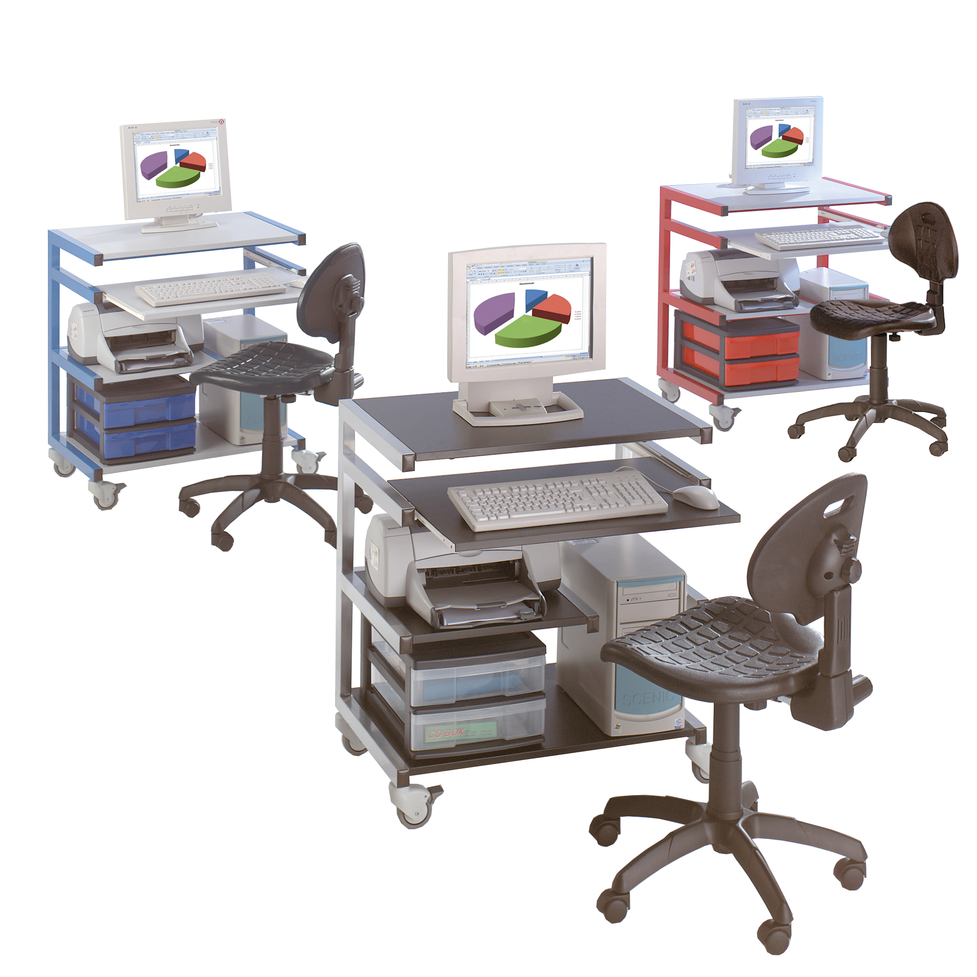 Auf vier Ebenen bringen sie alle erforderlichen Geräte unter. Jeder dieser PC-Arbeitsplätze ist serienmäßig mit vier Rollen ausgestattet, davon zwei feststellbar und abgestimmt in Farbe und Design.