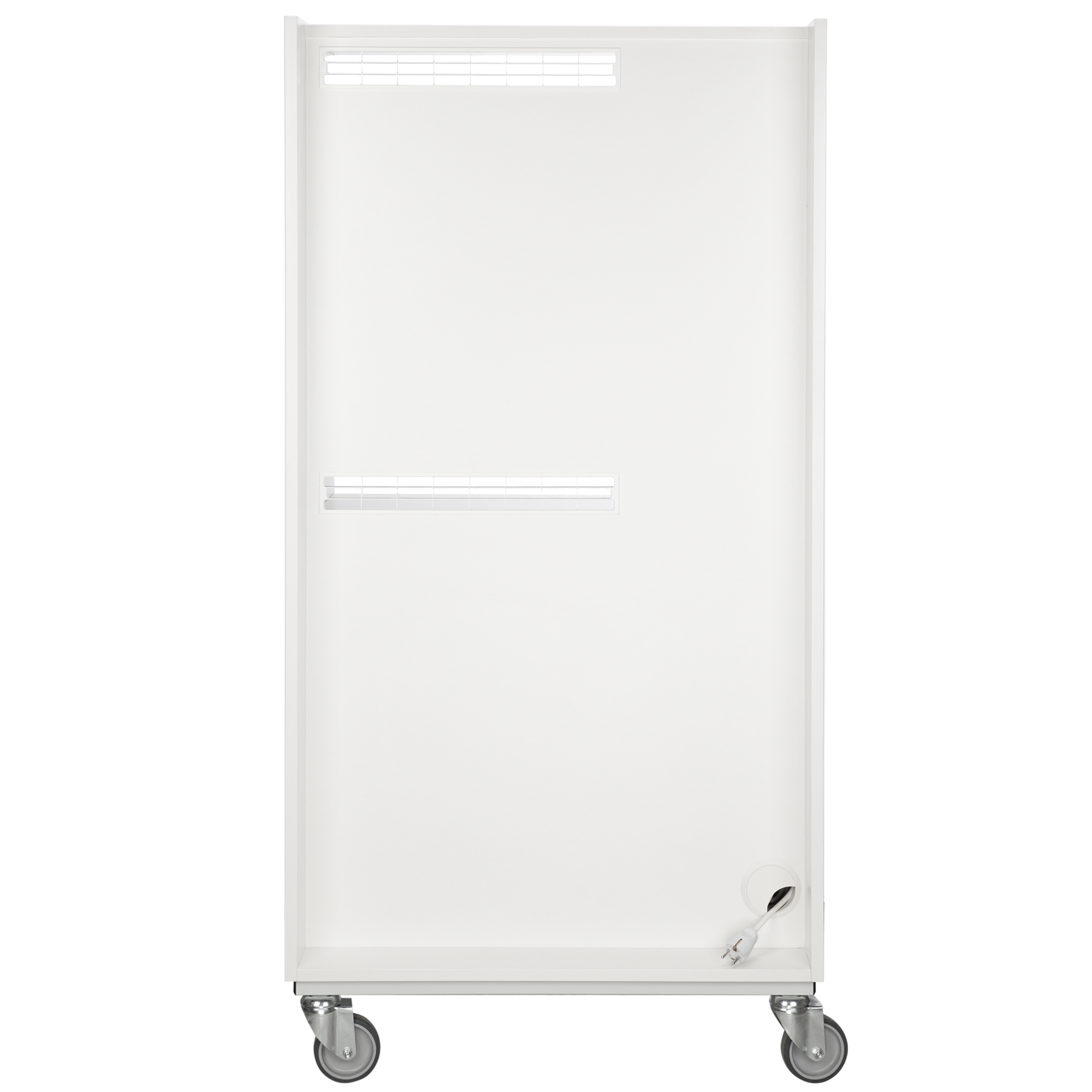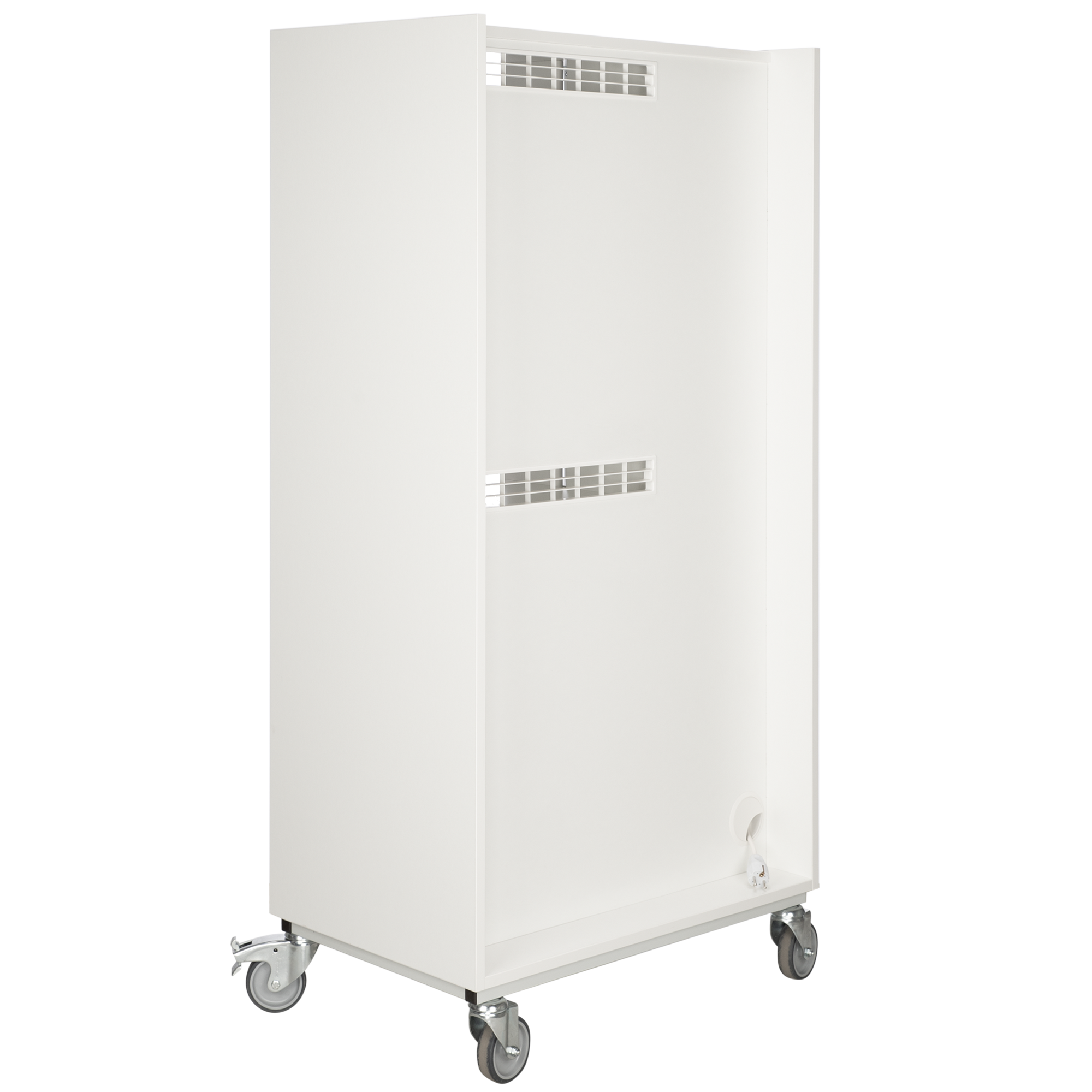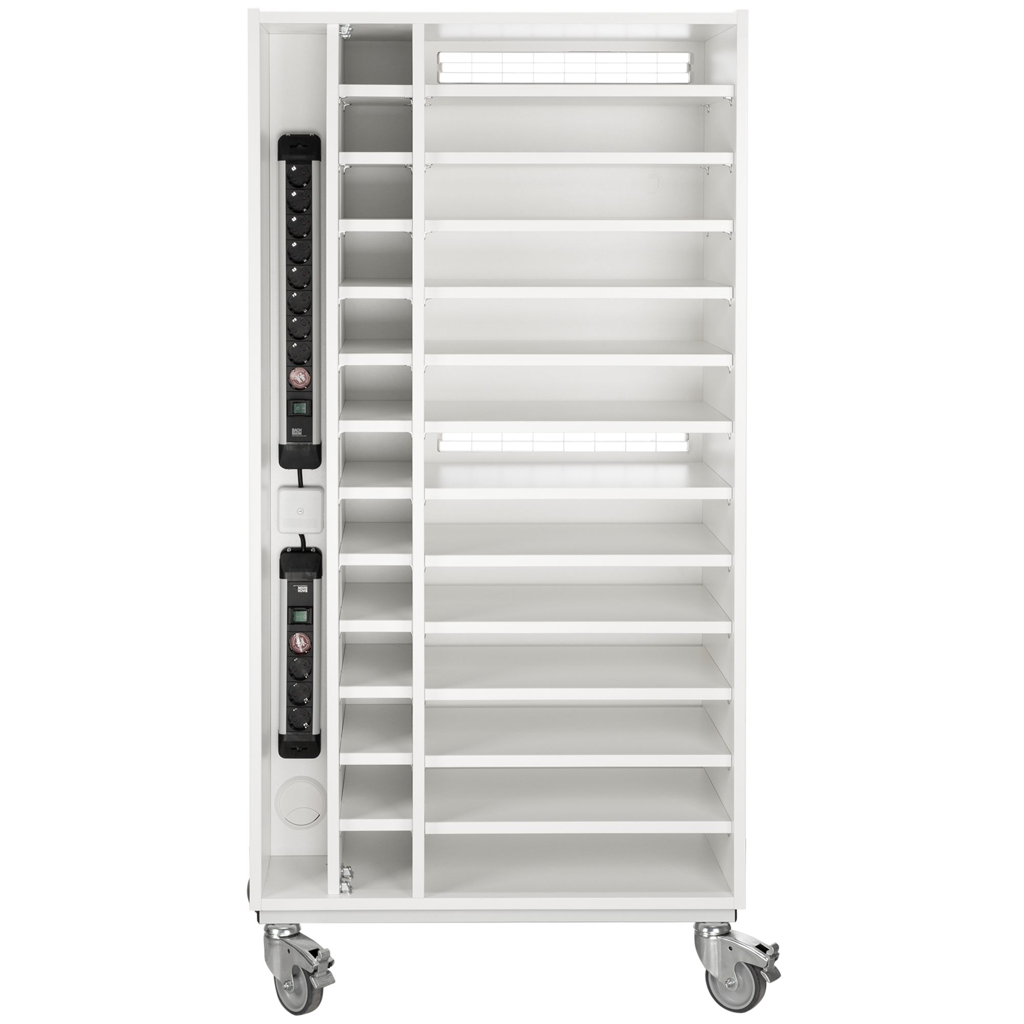 Das Notebookregal bietet Platz für 13 Notebooks bis zu 17" (Fachmaß: B/T 50x34 cm). Auf der rechten Seite befinden sich 2 x 8 Steckdosenplätze, die 2 Steckdosenleisten sind separat schaltbar. Die Notebookfächer befinden sich auf der linken Seite. An der Rückseite befinden sich zwei Lüftungsgitter. Eine zurückgesetzte Rückwand von 10 cm sorgt für zusätzlichen Stauraum von Kabeln und Zubehör.