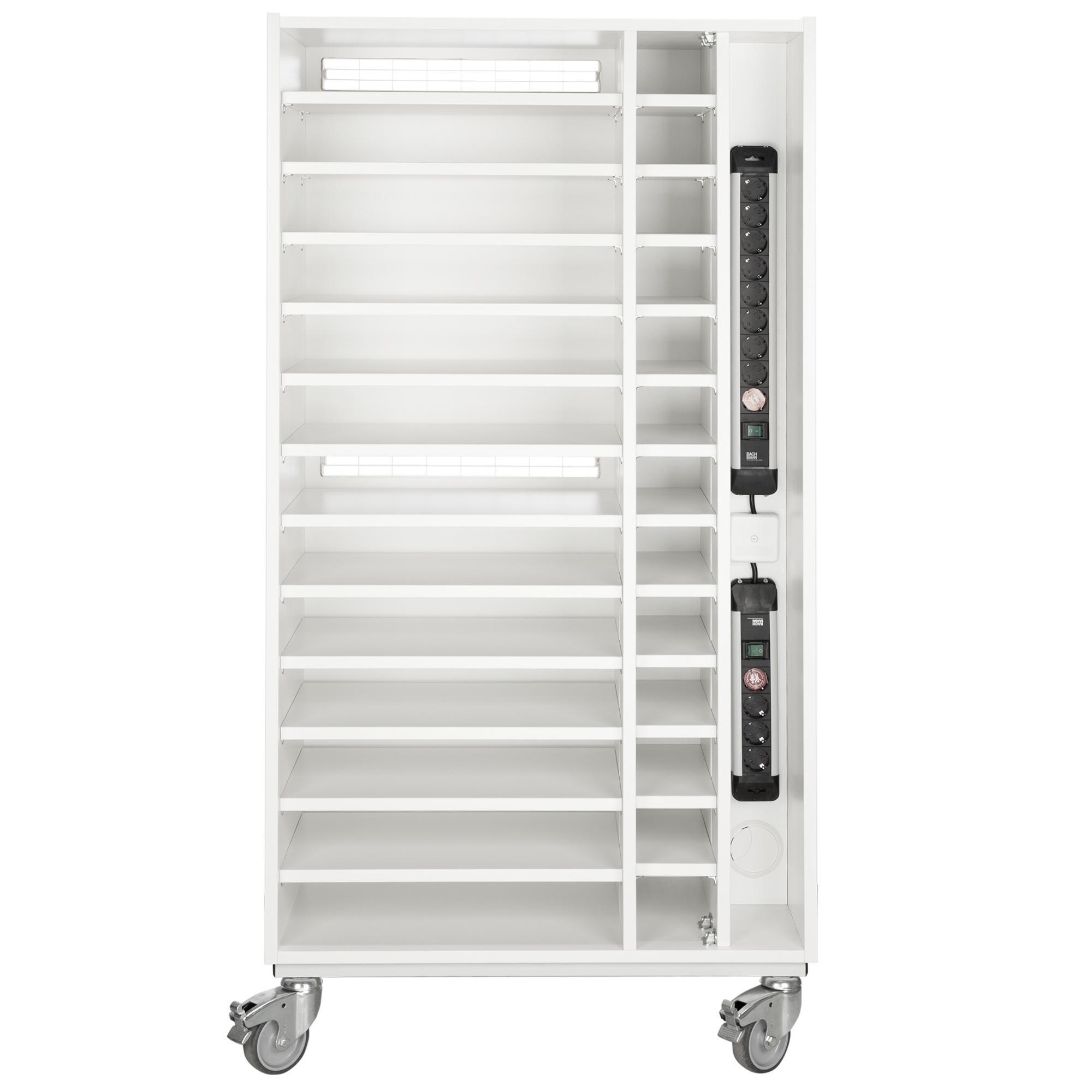 Das Notebookregal bietet Platz für 13 Notebooks bis zu 17" (Fachmaß: B/T 50x34 cm). Auf der rechten Seite befinden sich 2 x 8 Steckdosenplätze, die 2 Steckdosenleisten sind separat schaltbar. Die Notebookfächer befinden sich auf der linken Seite. An der Rückseite befinden sich zwei Lüftungsgitter. Eine zurückgesetzte Rückwand von 10 cm sorgt für zusätzlichen Stauraum von Kabeln und Zubehör.