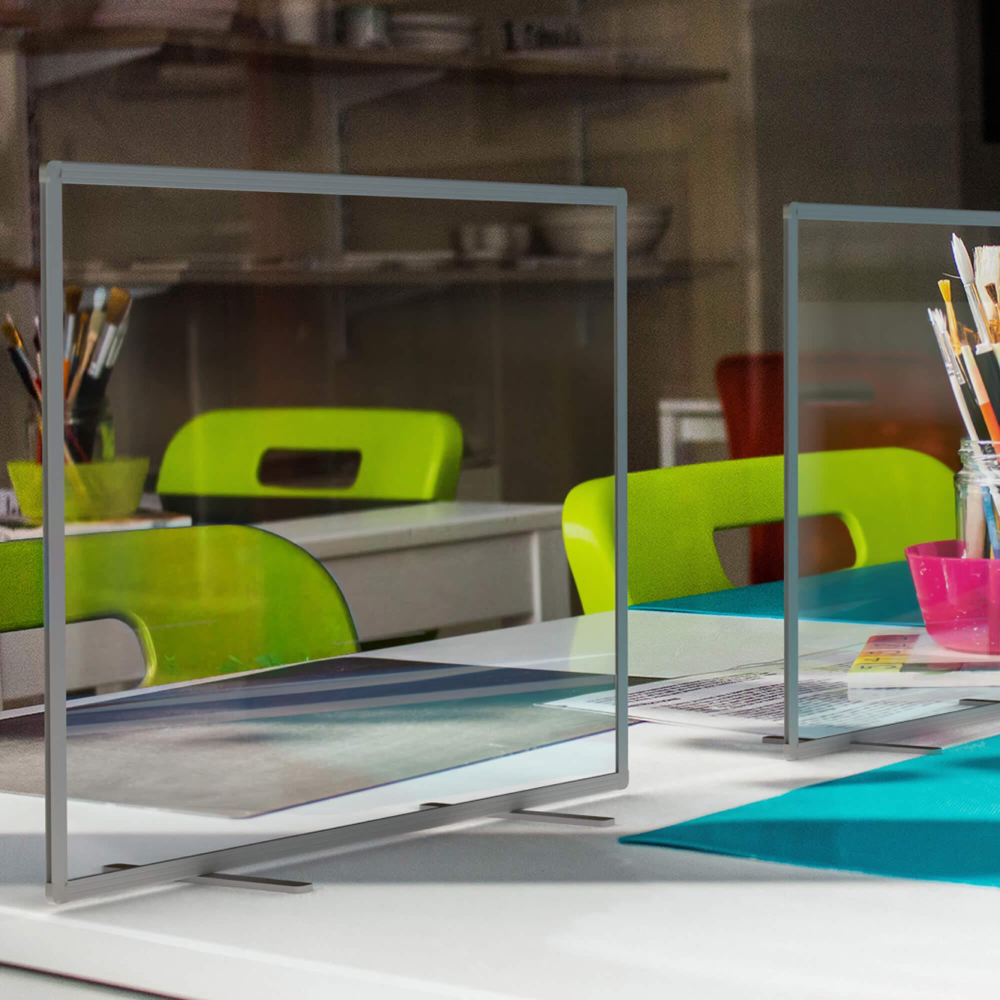 Unsere Schutzwände können einfach auf Tisch, Theke, oder sonstiges positioniert werden - fertig! Beliebig kombinierbar, kinderleicht auf- und abzubauen.