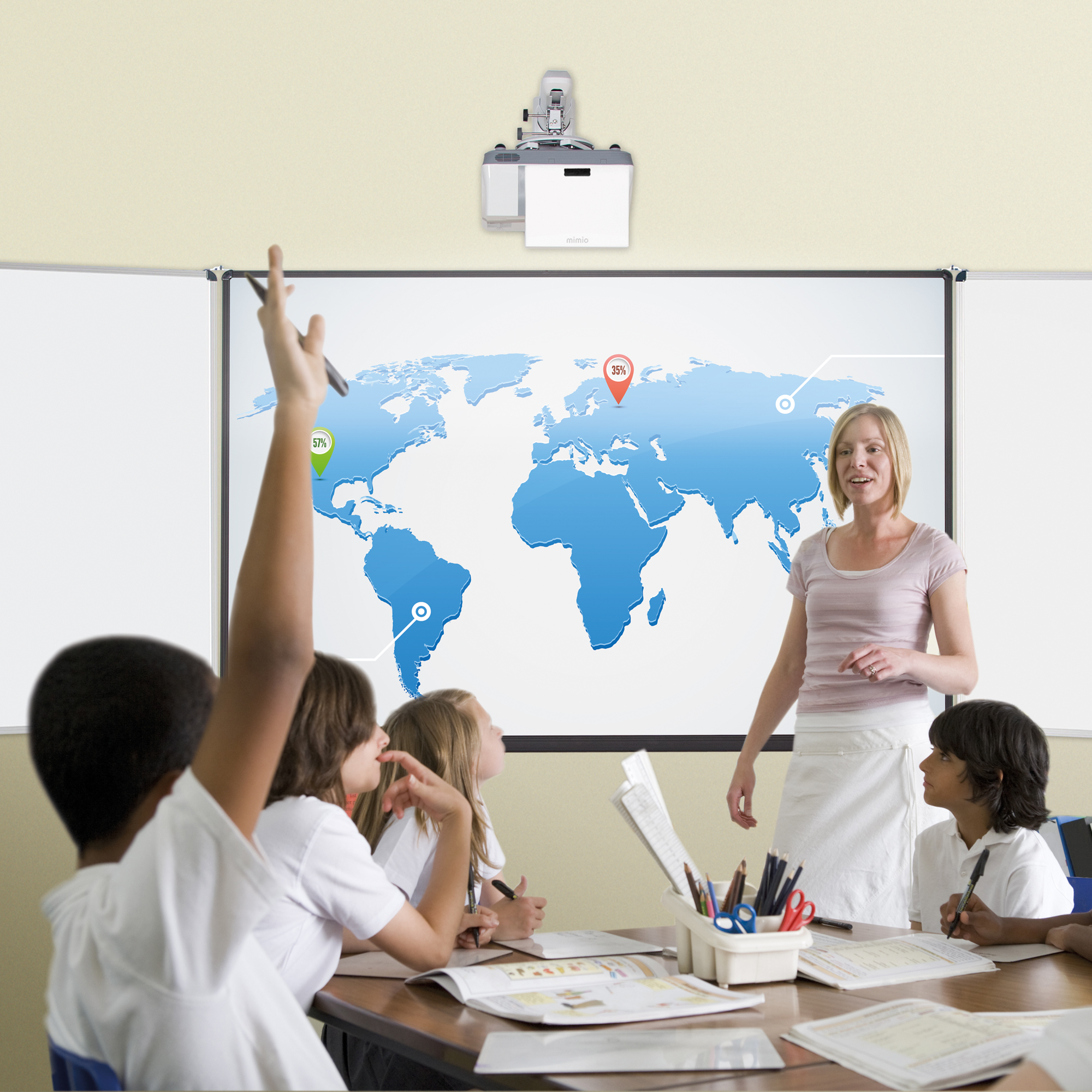 Unsere Projektionstafel für (stiftbedienbare interaktive) Ultranahdistanz-Projektoren. Die Mittelfläche in weiß ist projektionsoptimiert, magnethaftend und mit Spezial-Whiteboardmarkern beschreibbar, sowie trocken abwischbar.