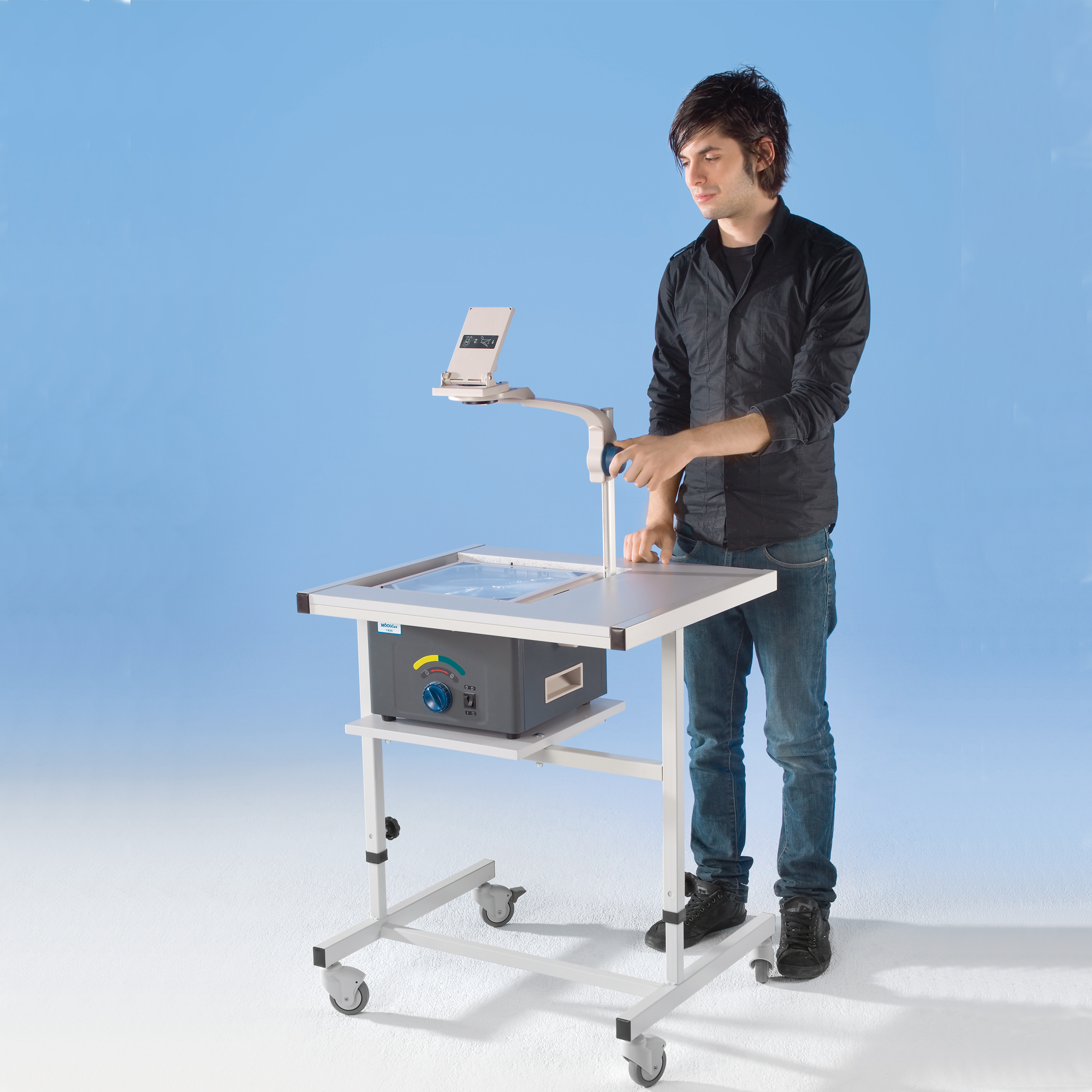 Alle Kanten geschlossen durch ABS-Kunststoffkante 2 mm stark. Ausschnitt für OHP. Fahrbar durch vier Lenkrollen, davon zwei feststellbar. Stufenlos höhenverstellbar bis Oberplattenhöhe von 110 cm. Projektorplatte: Standardstellhöhe von 27,5 cm