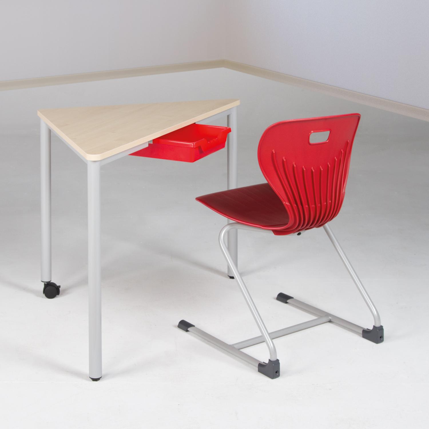 Dreieckstisch mit integrierter ErgoTray Box (C1) aus unseren ErgoTray Schrank- und Regallösungen. Die Pythagoras Dreieckstische sind an einem Standbein (90° Ecke) mit einer Rolle versehen und dadurch mobil. Die Standfüße sind Kunststoffgleitern ausgestattet.