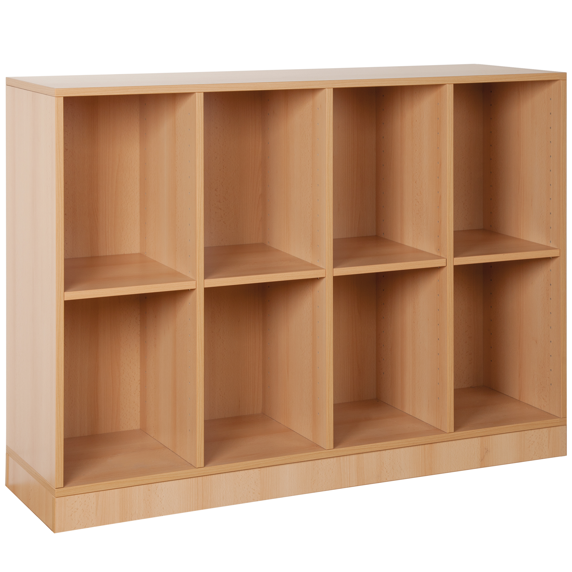 Das offene Regal bietet Stauraum für die Höhe von 2 Ordnern. Die 8 offenen Fächern sind mit 3 Mittelwänden getrennt. Durch 4 Einlegeböden lässt sich die Höhe der 6 Fächer im Raster von 32 mm beliebig variieren. Die Einlegeböden unserer Schränke sind mit einer Auszugsicherung versehen, die das ungewollte Herausziehen verhindert.