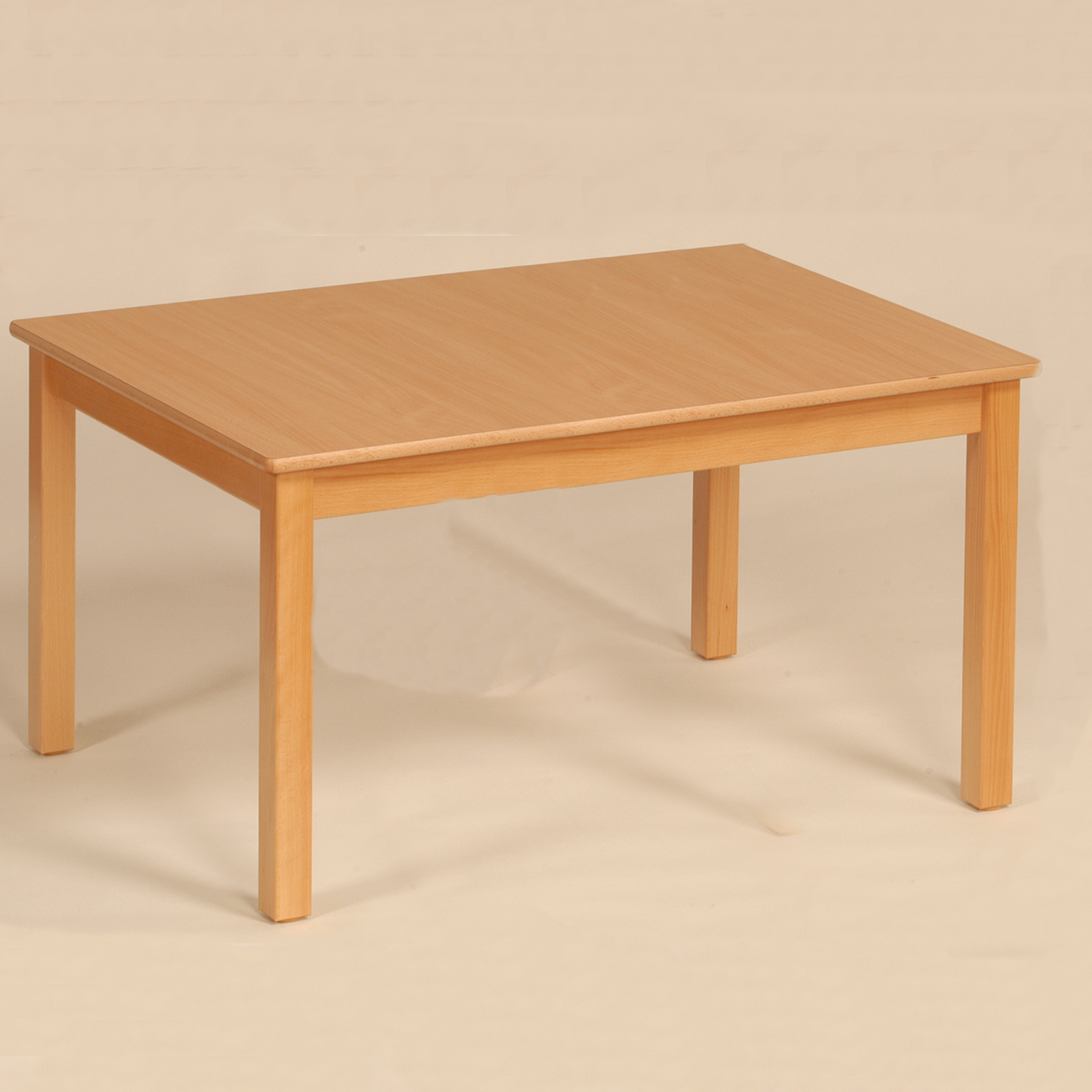 Die Beine und Zarge dieser Tische sind aus massivem Buchenholz, die Beine 50 x 50 mm, die Zargen 70 mm hoch und 22 mm stark. Die Tischplatten haben ca. 19 mm Dicke und beidseitig Schichtstoff, die Kante besteht aus einem abgerundeten Buche-Massivholzeinleimer. Die sehr widerstands- und strapazierfähige Beschichtung eignet sich hervorragend für den Einsatz im Kindergartenbereich.