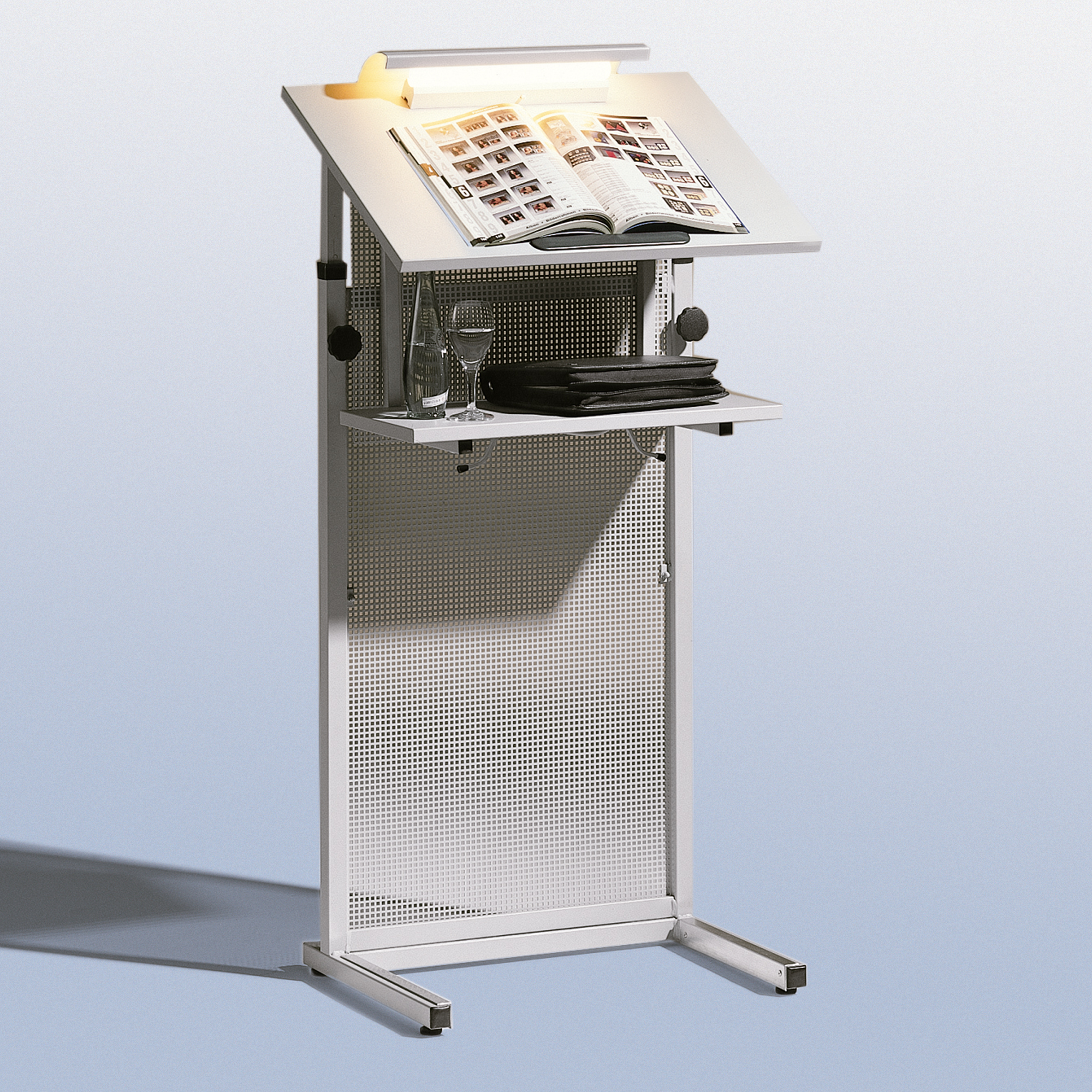 Dieses Rednerpult ist mit einer Lochblech-Frontblende und einer 3fach-Steckdose versehen. Die Manuskriptablage ist durch Handräder höhenverstellbar von 106 bis 128 cm.
