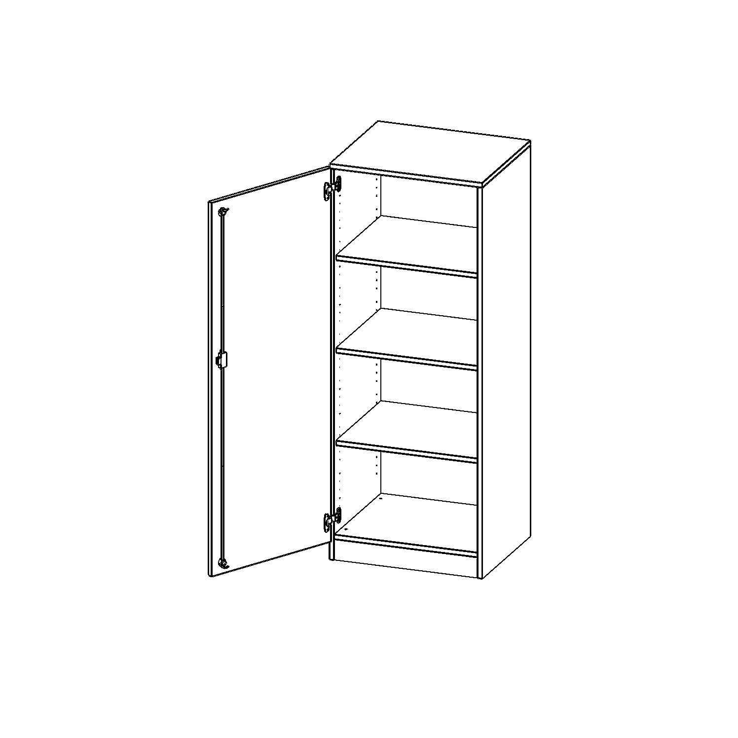 Alle Schränke werden aus melaminharzbeschichteter E1-Feinspanplatte gefertigt, die FSC zertifiziert und formaldehydfrei sind. Als Kanten verwenden wir besonders robuste 2 mm starke ABS Kanten, die unter hoher Temperatur fest verleimt werden. Bitte wählen Sie Ihr Wunschdekor aus unserer Dekorpalette aus. Die Einlegeböden sind im Raster von 32 mm verstellbar. Unsere hochwertigen Bodenträger verfügen über einen "Ausziehstop", so wird verhindert, dass Böden mit Inhalt darauf aus dem Regal oder Schrank rutschen können. Die Türen lassen sich dank 270° öffnender Scharniere an den Korpus anlegen. Sie sind mit einem Schloss verschließbar. An den Türen befindet sich eine Staublippe.