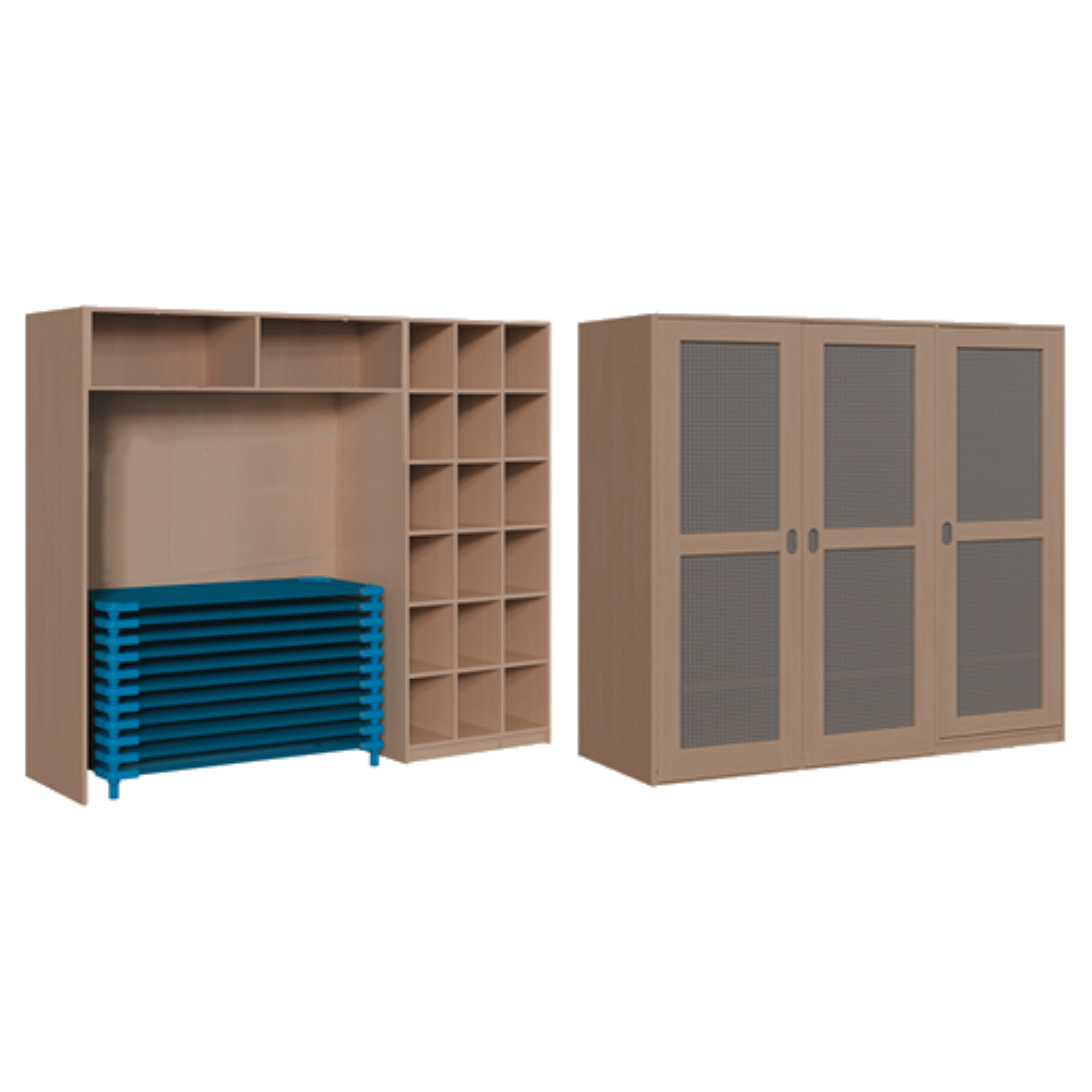 Bis zu 20 Kinderliegen lassen sich im Schrank unterbringen. Und das Praktische dabei: das Bettzeug lagert gleich in Reichweite. 20 hygienisch getrennte Fächer sind dafür vorgesehen. Die Türen in Rahmenbauweise haben eine farbenfroh gestaltbare Lochblechfront, welche der guten Durchlüftung dient. Das Türen- und Korpusdekor können Sie nach unserem Dekorangebot wählen, ebenso ist die Lochblechfarbe nach RAL-Tönen aus unserem Angebot wählbar.