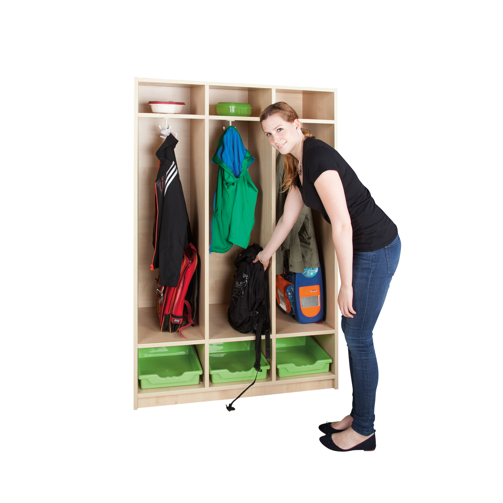 Lieferbar ist das Regal für 2 oder 3 Personen, das pro Fach jeweils 2 Einlegeböden besitzt. Dementsprechend verfügt es über jeweils 3 Fächer, in denen Handschuhe, Schals oder Brotdosen perfekt ihren Platz finden. Während sich der Dreifachhaken optimal zum Aufhängen von Jacken oder Taschen eignet, bieten unsere ErgoTrayBoxen optimalen Raum für Schuhe.
