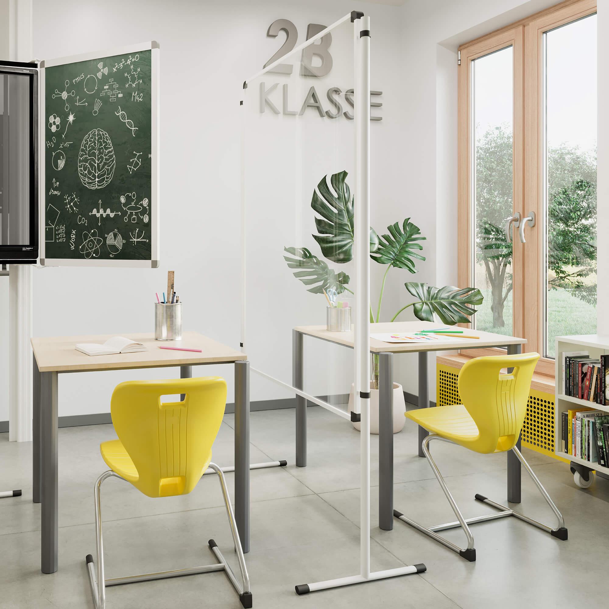 Unsere Schutzwände können einfach in die Stative gehängt werden, fertig! Beliebig kombinierbar, kinderleicht auf- und abzubauen, quer- und längsförmig verwendbar.