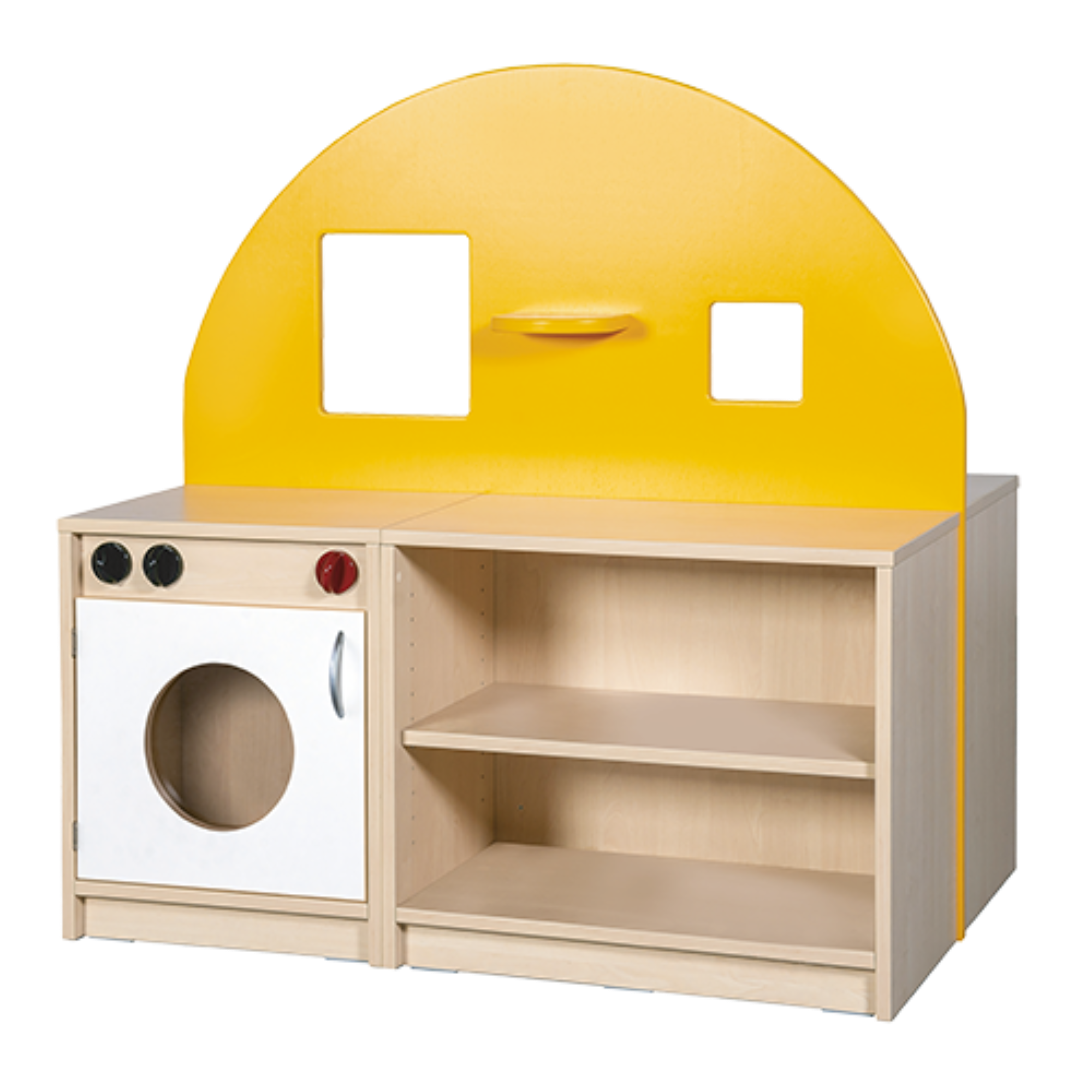 Praktische Details wie ein drehbarer Wasserhahn, ein herausnehmbares Spülbecken, eine Kochfeldnachbildung und farbige Drehknöpfe aus Kunststoff bringen echtes Küchenfeeling in die Kinderspielwelt. Bei dieser Spielmöbelkombination ist sogar die Waschmaschine mit integriert. Die hochwertig verbauten Materialien sind leicht zu reinigen.