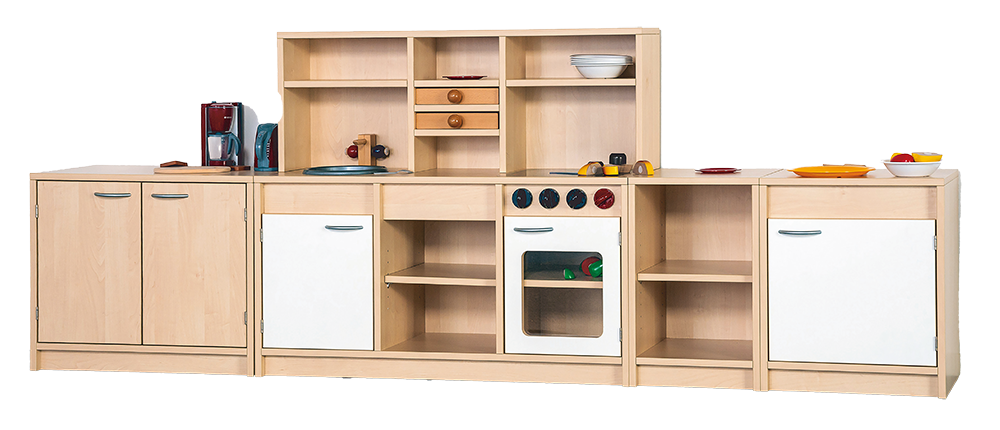 Diese hochwertige Spielküche lässt Kinderherzen höherschlagen! Mit dem fest verleimten Korpus und stabiler Sichtrückwand ist dieses Spielküchenmöbel bestens für fantasievolles Spielen geeignet. Die weißen, lackierten Multiplex-Türen und die schicken Metallbogengriffe in Alusilber sorgen für einen modernen Look.