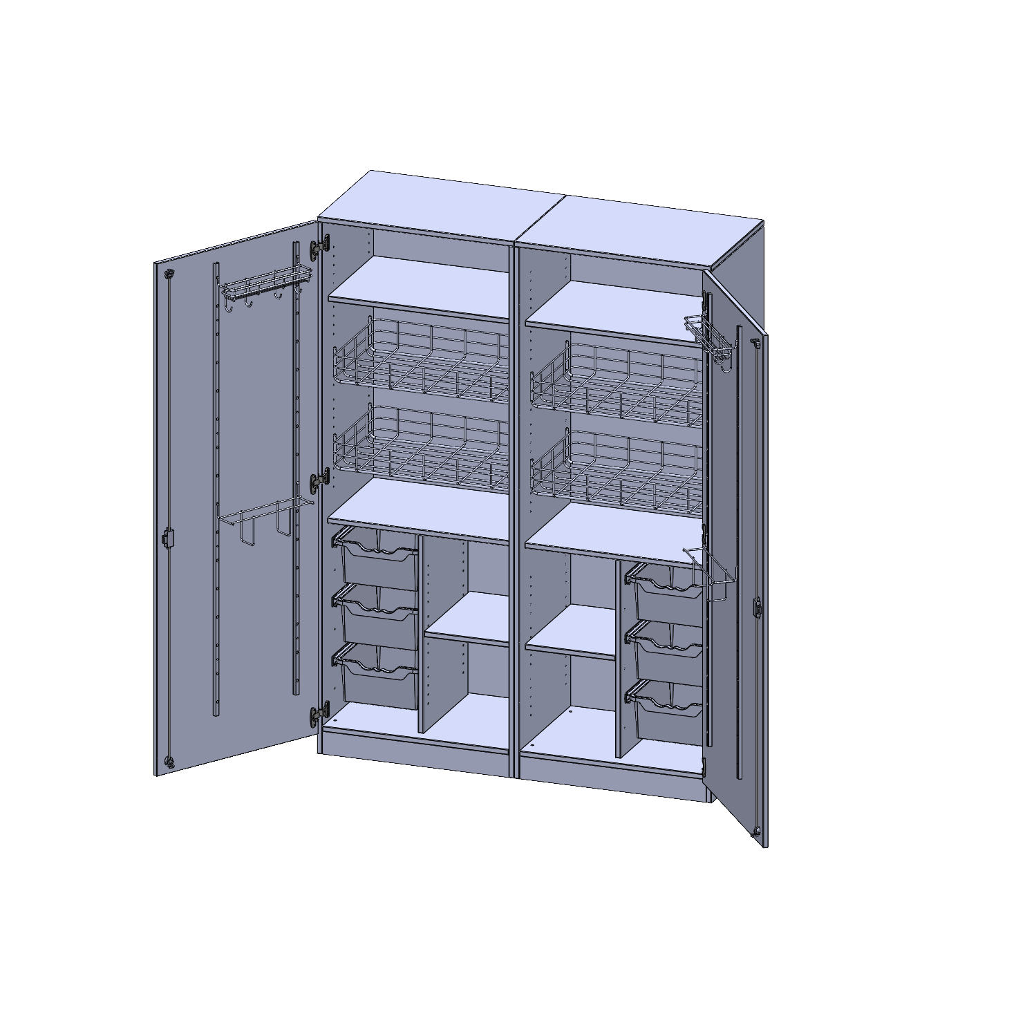 Alle Schränke werden aus melaminharzbeschichteter E1-Feinspanplatte gefertigt, die FSC zertifiziert und formaldehydfrei sind. Als Kanten verwenden wir besonders robuste 2 mm starke ABS Kanten, die unter hoher Temperatur fest verleimt werden. Bitte wählen Sie Ihr Wunschdekor aus unserer Dekorpalette aus. Die Einlegeböden sind im Raster von 32 mm verstellbar. Unsere hochwertigen Bodenträger verfügen über einen "Ausziehstop", so wird verhindert, dass Böden mit Inhalt darauf aus dem Regal oder Schrank rutschen können. Die Türen lassen sich dank 270° öffnender Scharniere an den Korpus anlegen. Sie sind mit einem Schloss verschließbar. An den Türen befindet sich eine Staublippe.